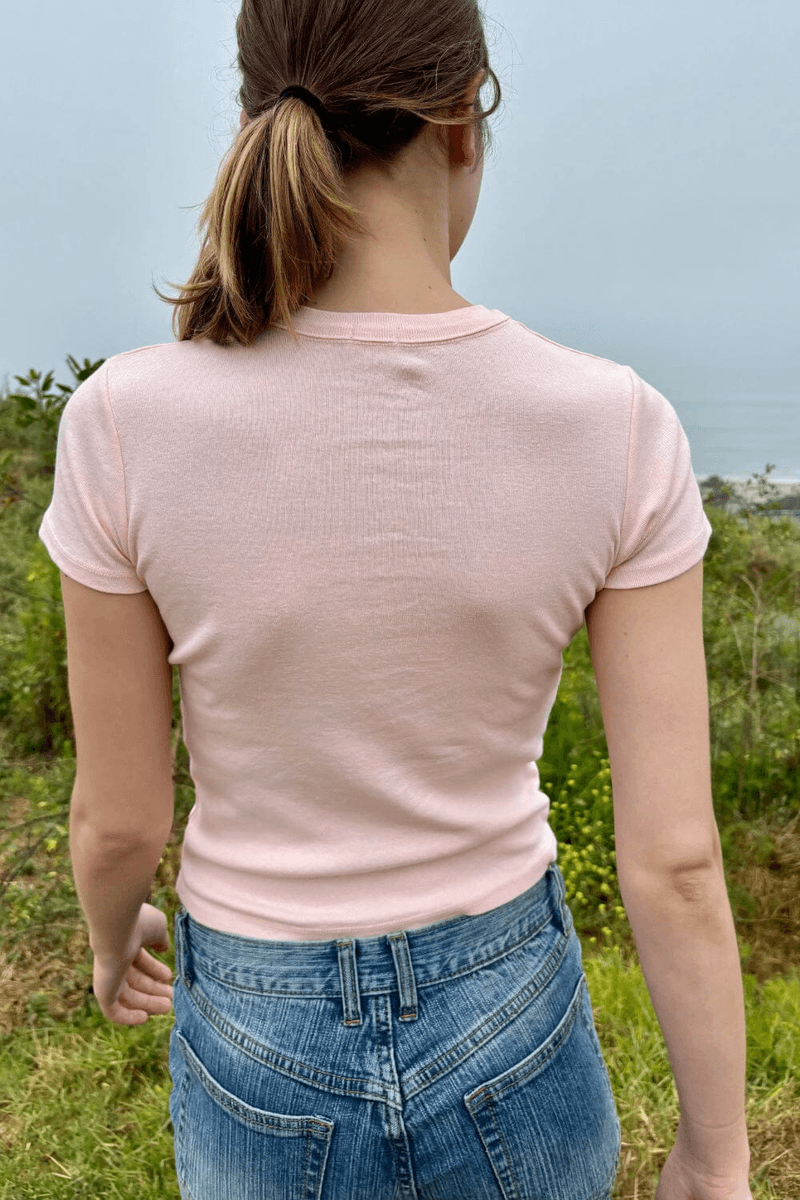 top Brendy Melville Hailie Světle Růžové Je Navržen Pro Bezproblémové Stylování. Kombinujte Ho Se Svými Oblíbenými Džíny Pro Chic Každodenní Vzhled Nebo Ho Oblečte S Sukní Na Večer Ven. Jeho Lehká Tkanina Zajišťuje, že Zůstanete V Chladu Během Teplejších Dnů, Zatímco Přiléhavý Silueta Dodává Vašemu Outfitu Nádech Elegance. Vyrobeno S Péčí V číně, Toto Tričko Kombinuje Kvalitu S Trendy Estetikou.