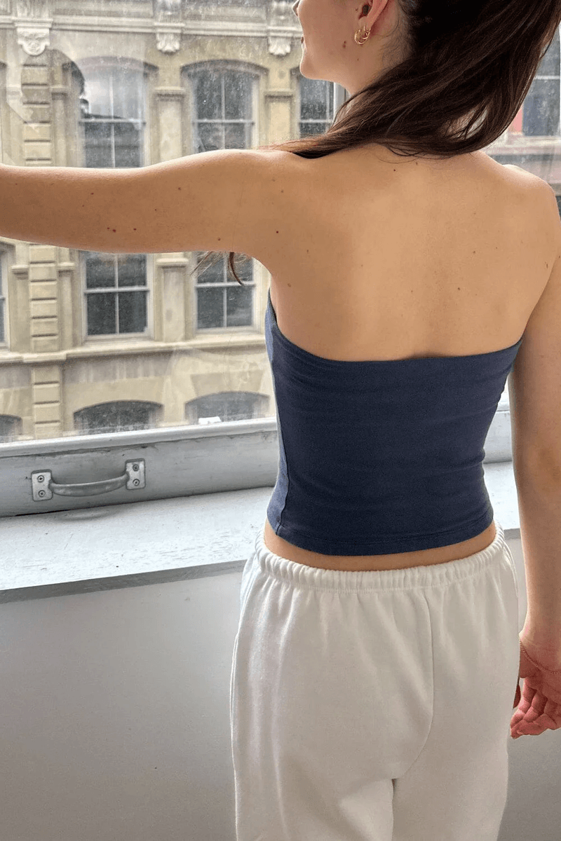 de brandy Melville Amelia Crop Top Vervaagd Blauw Heeft Een Trendy Strapless Ontwerp, Met Een Lengte Van 11 Inch (28 Cm) En Een Borstomvang Van 12 Inch (30 Cm). Dit Topje Is Veelzijdig Genoeg Om Op Te Kleden Met Een Rok Of Casual Te Houden Met Je Favoriete Jeans. De Unieke Kleur En Pasvorm Maken Het Een Must-have Toevoeging Aan Je Lente- En Zomergarderobe.