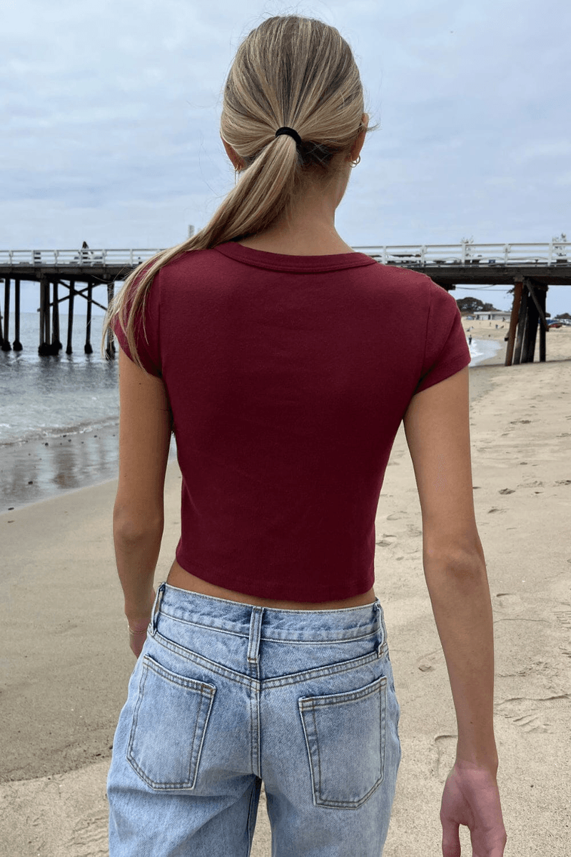 verhoog Je Garderobe Met De brandy Melville Ashlyn Crop Top Bordeaux, Een Onmisbaar Item Voor Elke Modebewuste Persoon. Dit Veelzijdige Cropped T-shirt Combineert Comfort En Stijl, Waardoor Het Perfect Is Voor Elke Gelegenheid.