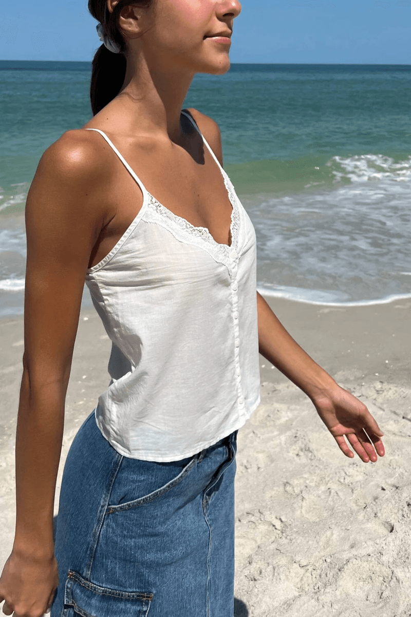 gardırobunuzu brandy Melville Sylvie üst Beyaz Ile Yükseltin, Her Durum Için Mükemmel Olan Muhteşem Dantel Detaylı Bir Askılı Bluz. Bu çok Yönlü Parça, şık Bir Düğmeli Tasarım, Ayarlanabilir Askılar Ve Siluetinizi Vurgulayan Hoş Bir Yuvarlak V-yaka Ile Donatılmıştır.