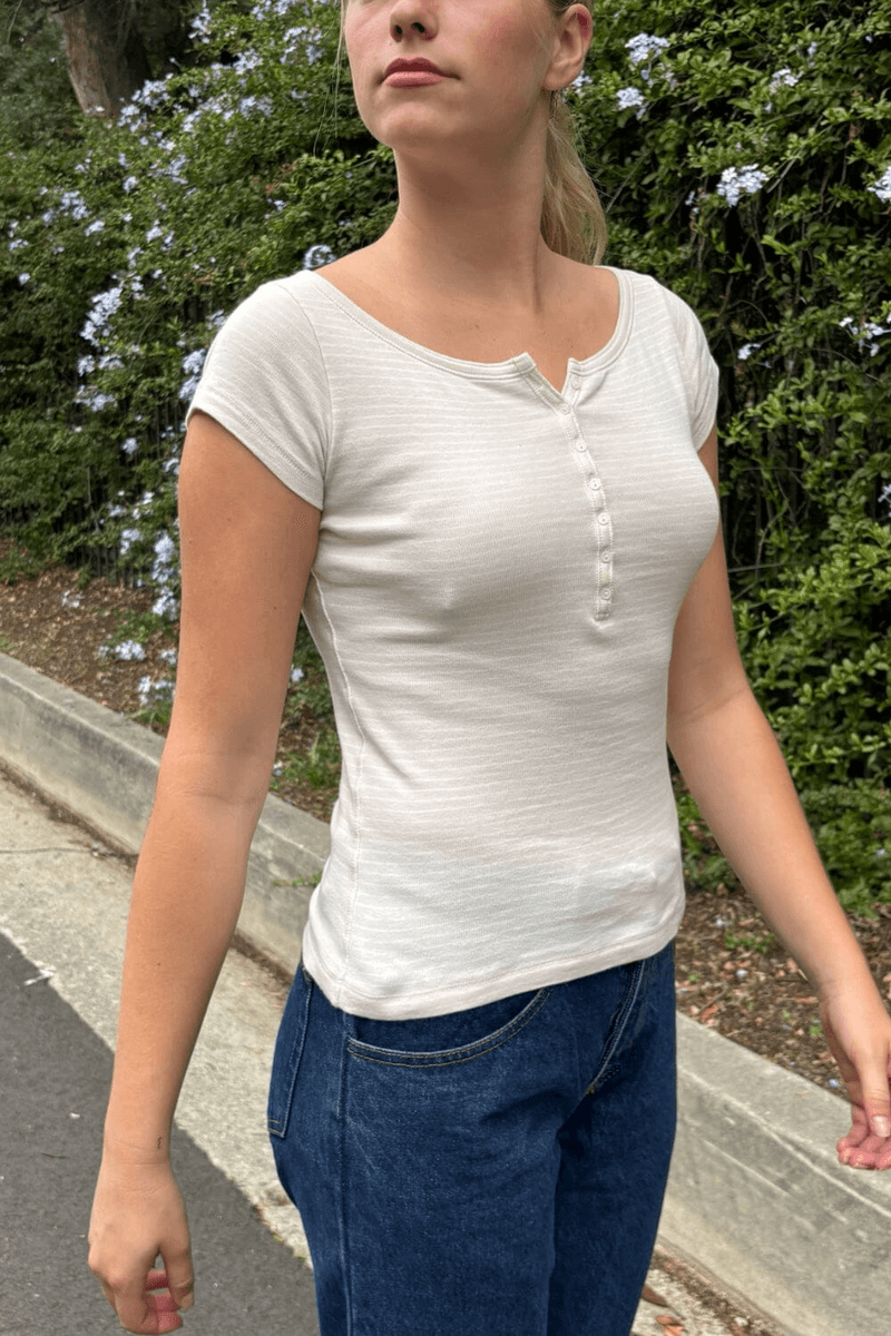 повдигнете ежедневния си гардероб с brandy Melville Zelly Striped Top в бяло с бежови райета. този прилепнал топ с къс ръкав съчетава стил и комфорт, което го прави задължителен за всеки моден ентусиаст. с елегантното си деколте и очарователните детайли с копчета, този топ е перфектен както за ежедневна носене, така и за специални поводи.