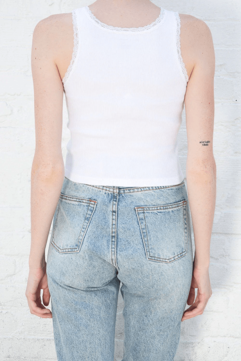 топът с дантела Ronnie Rib на Brandy Melville в бяло е идеален за наслагване или носене самостоятелно. съчетайте го с любимите си дънки за неформален ден навън или го облечете с пола за вечер на града. меката памучна материя осигурява комфорт през целия ден, докато дантелите предлагат изискан акцент, който може да повдигне всяка визия. независимо дали тичате по задачи или се наслаждавате на спокойно бранч, този топ е вашият избор.