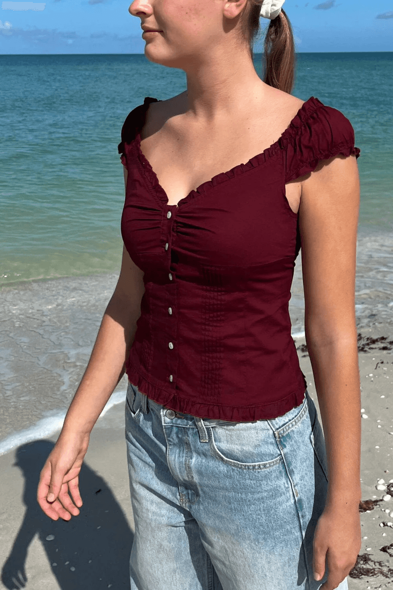 pozvedněte Svůj šatník S Ohromujícím topem Brandy Melville Elena Burgundské Barvy. Tento Stylový Top Na Knoflíky Je Navržen Tak, Aby Ohromil, A Má Elastický Výstřih Do V A Jemné Volánkové Detaily, Které Dodávají Každému Outfitu Nádech ženskosti.