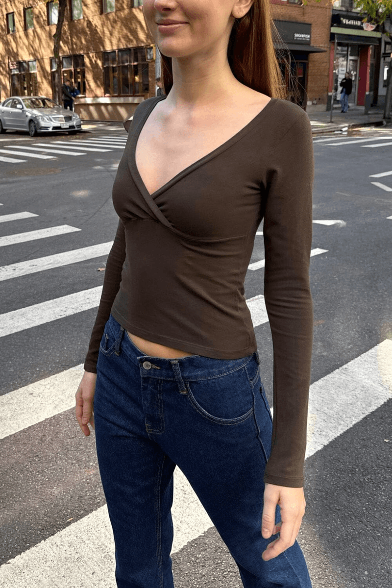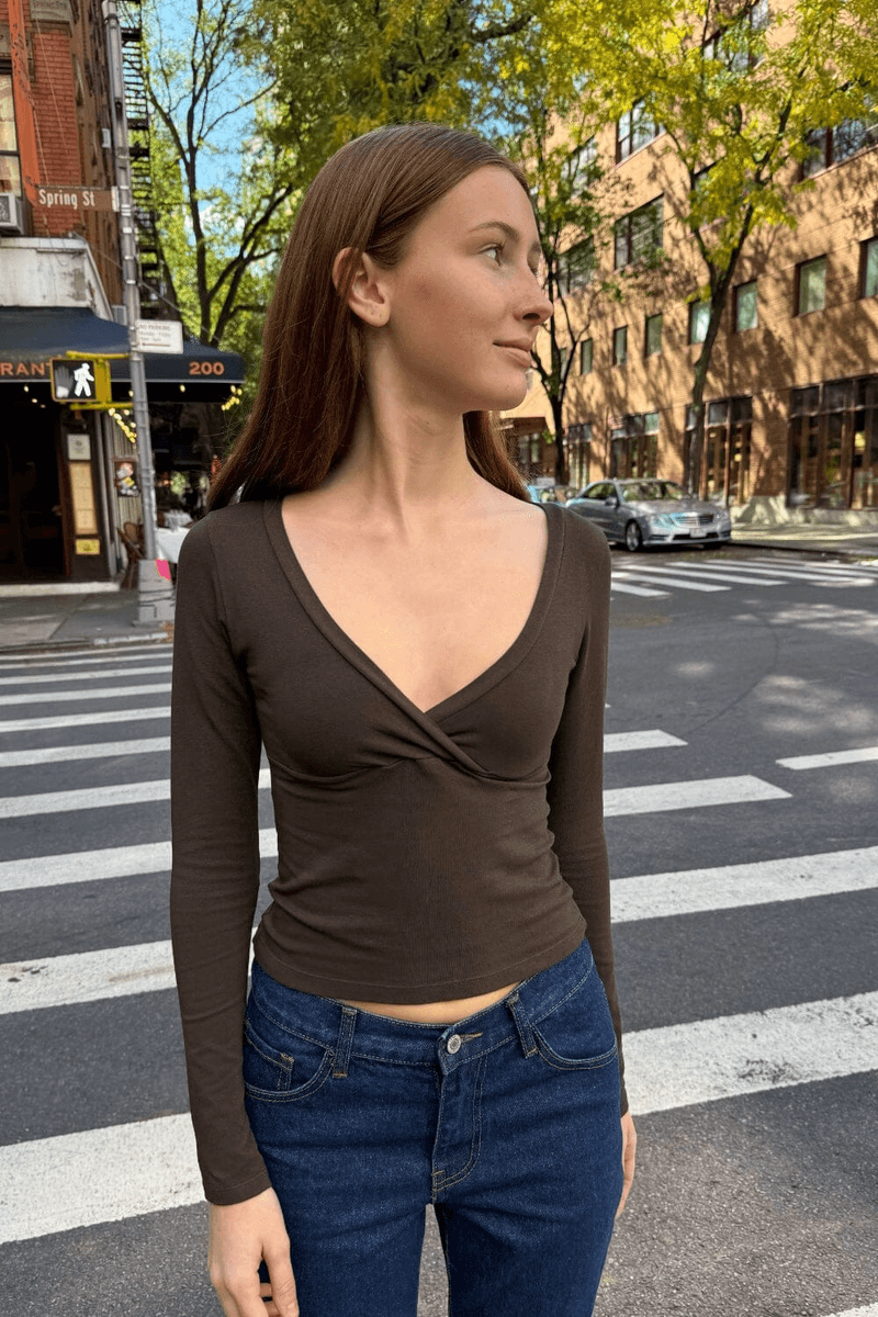 top Mocha Brandy Melville Amara Není Jen Top; Je To Výjimečný Kousek. Unikátní Překřížený Design Dodává Nádech Elegance, Což Ho činí Vhodným Jak Pro Neformální Výlety, Tak Pro Formálnější Příležitosti. Kombinujte Ho S Džíny Pro Uvolněný Vzhled Nebo Se Sukní Pro Více Upravený Outfit. Dlouhé Rukávy Zajišťují, že Zůstanete Pohodlní, Aniž Byste Obětovali Styl, Což Z Něj činí Nezbytný Kousek Pro Vaši Sbírku.