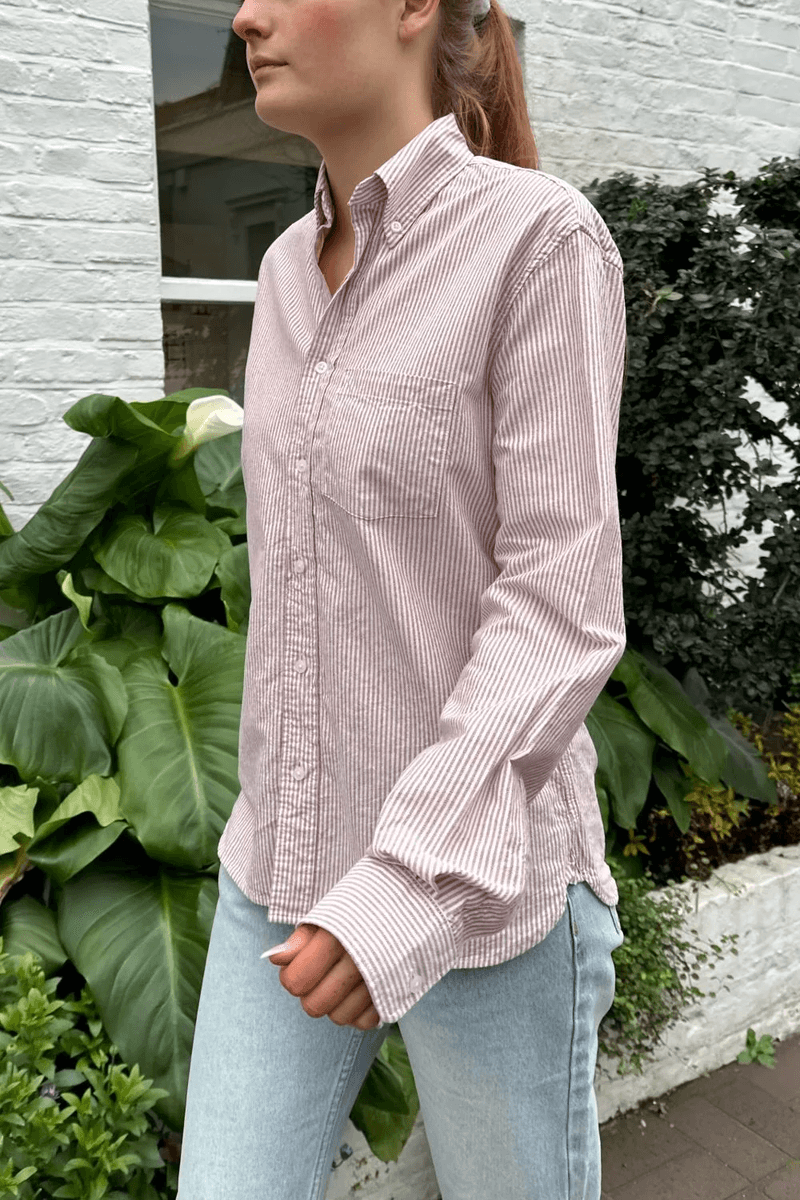 pozvedněte Svůj šatník S Topem S Pruhy Stephanie Od Brandy Melville, Který Se Pyšní Elegantním Designem V Růžových A Bílých Pruzích, Jenž Dodává Každému Outfitu Nádech Elegance. Tato Blůza S Dlouhým Rukávem A Knoflíky Je Ideální Jak Pro Neformální Výlety, Tak Pro Stylové Setkání.