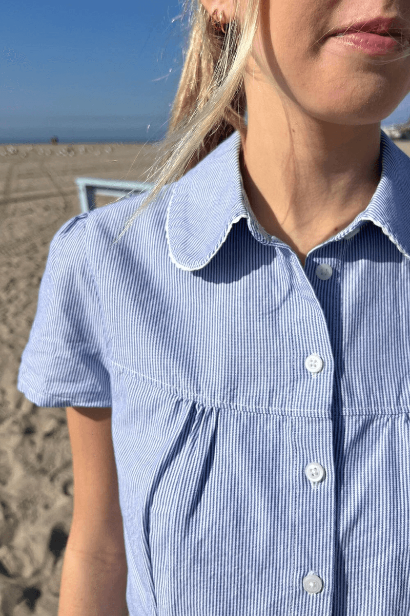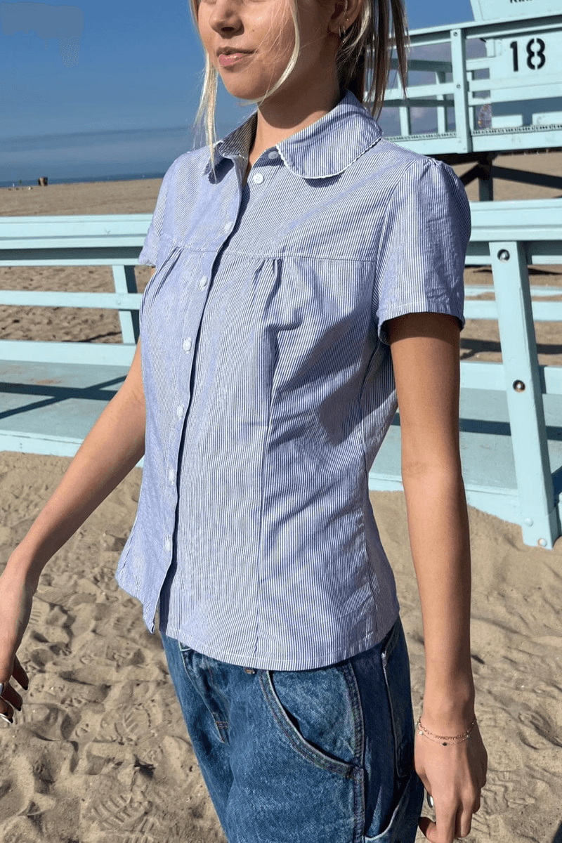 brandy Melville Teagan Stripes Top Kombinuje Pohodlí A Eleganci, Což Z Něj činí Nezbytnost Pro Váš šatník. Díky Svému Lehkému Bavlněnému Materiálu Tato Košile Zajišťuje, že Zůstanete V Chladu A Pohodlí Po Celý Den. Klasický Límečkový Styl Dodává Nádech Sofistikovanosti, Zatímco Krajkové Detaily Nabízejí ženský Nádech.