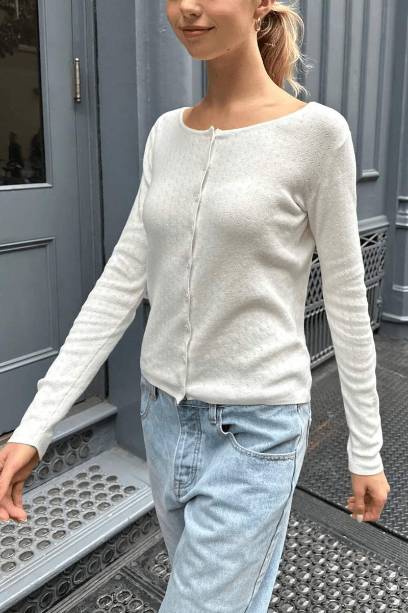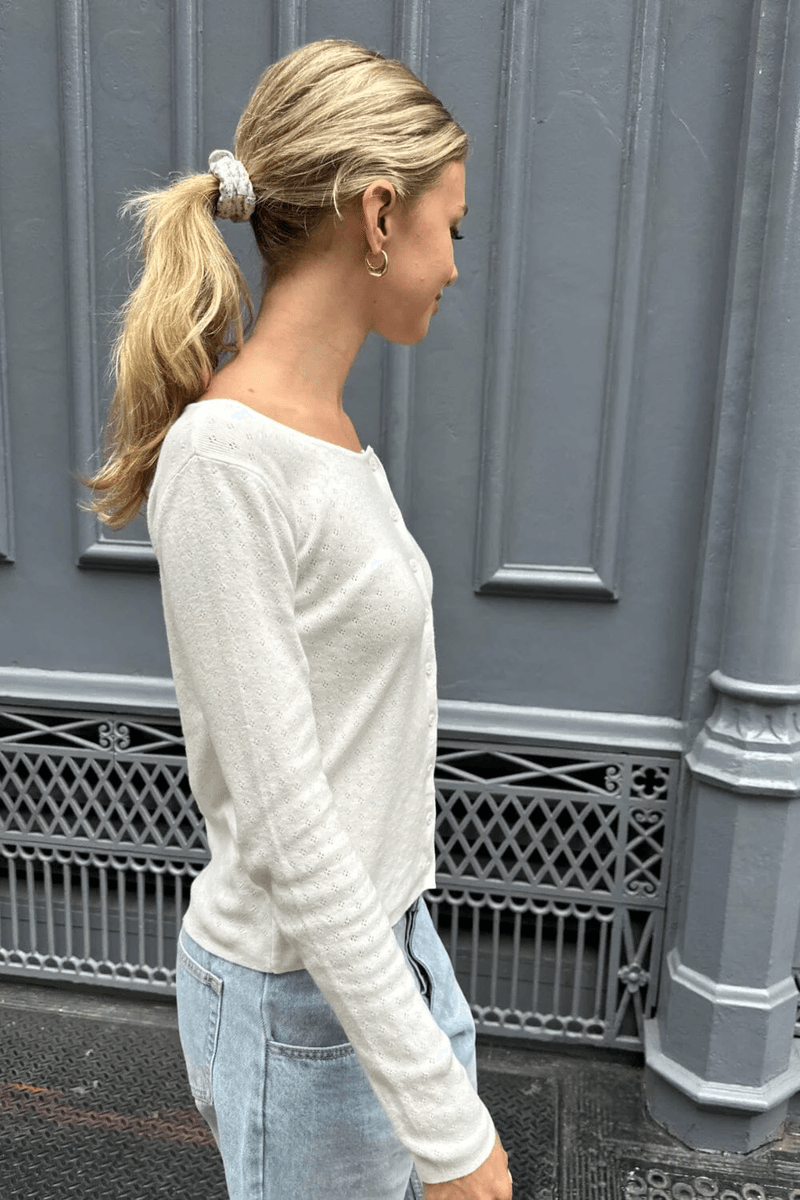 bílý Top Brandy Melville Athelia Je Vyroben Z 100% Bavlny, Což Zajišťuje Maximální Pohodlí A Zároveň Vás Udržuje Stylovou. Design S Očky Přináší Jedinečný Nádech, Který Odlišuje Tento Top Od Běžných Košil. Ať Už Se Chystáte Na Neformální Den Venku Nebo Na Speciální Událost, Tento Top S Dlouhým Rukávem Usnadňuje Dosažení Upraveného Vzhledu.