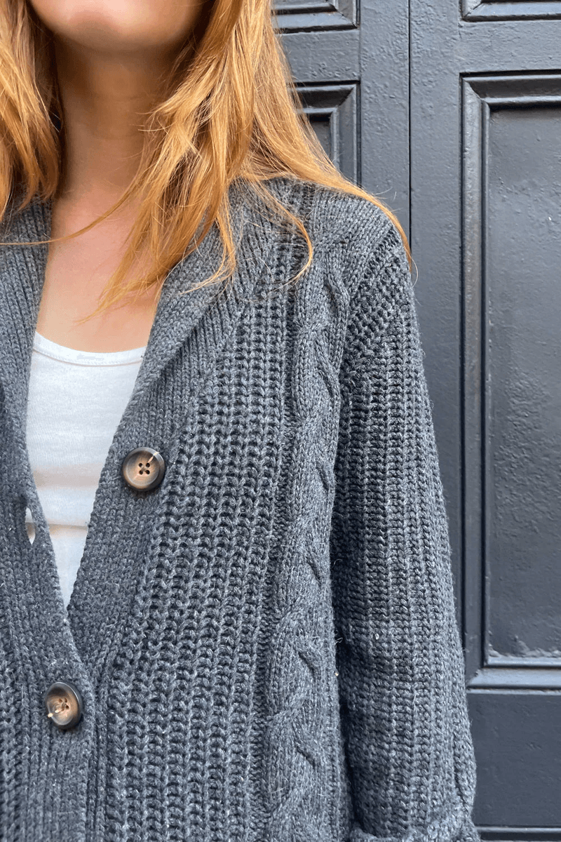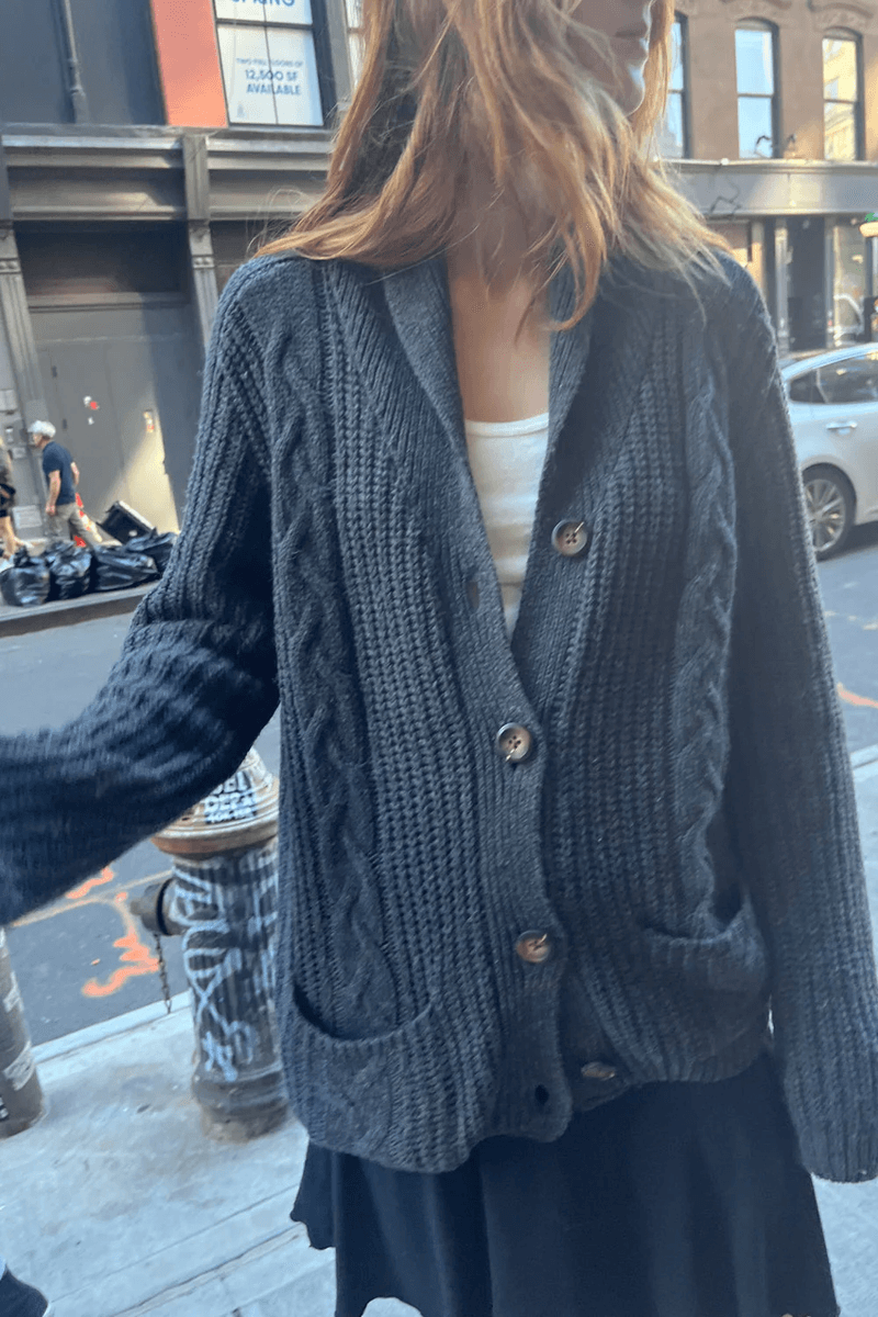 užijte Si útulnou Eleganci cardiganu Z Podzimní Vlny S Pleteným Vzorem Od Brandy Melville V Barvě Antracit. Tento Oversized Cardigan Na Knoflíky Je Vaším Dokonalým Společníkem Na Chladné Dny, Který Bez Námahy Spojuje Styl A Pohodlí.