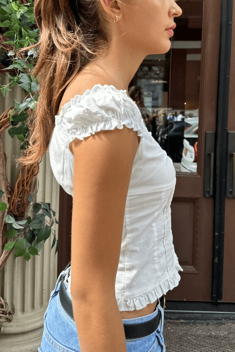 pozvedněte Svůj šatník S brandy Melville Elena Top Bílé. Tento Chic Button-up Top Má Lichotivý Elastický V-krk A Okouzlující Volánkový Detail, Což Z Něj činí Ideální Volbu Pro Jakoukoli Příležitost, Od Neformálních Výletů Po Speciální Akce.