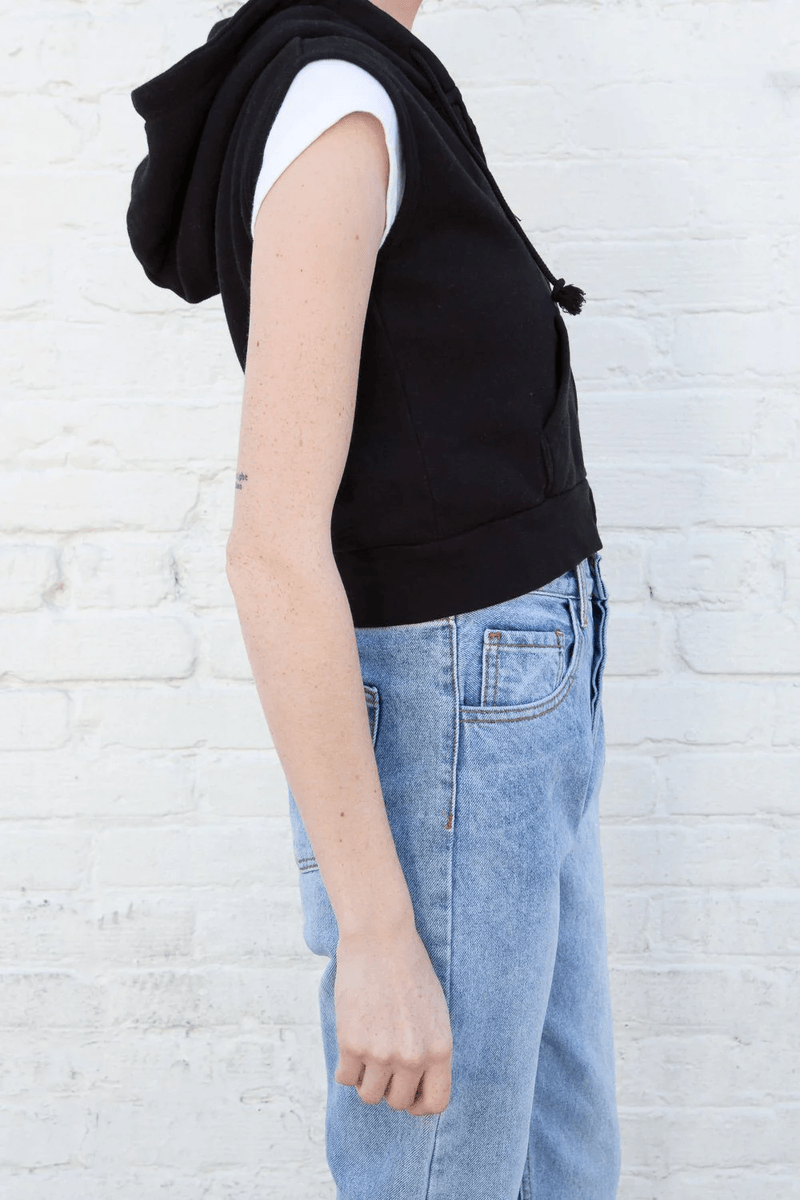 oplevel Den Ultimative Komfort Og Stil Med brandy Melville Candice Tank Hoodie Sort. Denne Super Bløde, Cropped Fleece-forede Tank Hoodie Er Perfekt Til Lagdeling Eller At Bære Alene. Dens Alsidige Design Gør Den Til Et Must-have I Enhver Garderobe.
