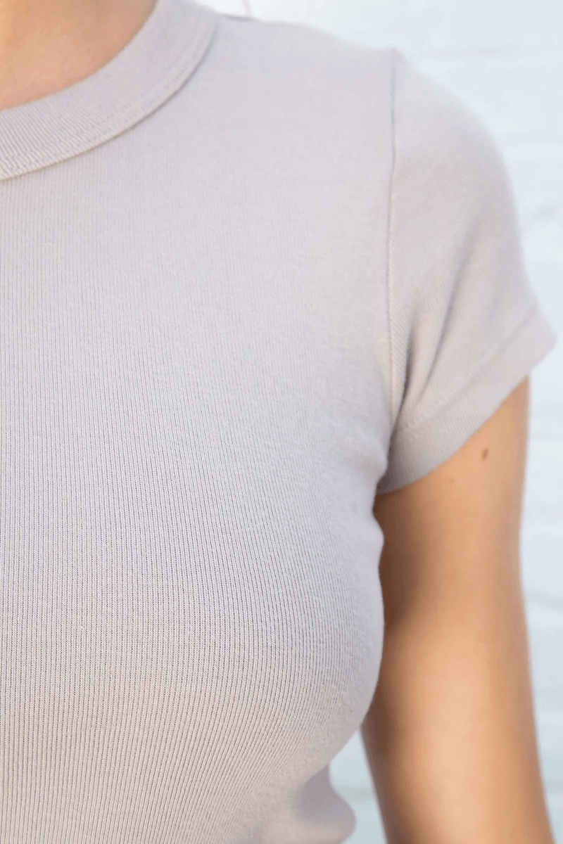 den brandy Melville Hailie Top Lilla Taupe Er Perfekt Til Lagdeling Eller At Bære Alene. Dens Cropped Stil Gør Den Ideel Til At Parre Med Højtaljede Jeans Eller Nederdele, Så Du Kan Skabe Alsidige Looks Til Enhver Lejlighed. Uanset Om Du Skal Til Brunch Med Venner Eller En Afslappet Dag Ude, Lover Denne T-shirt At Holde Dig Stilfuld Og Komfortabel.