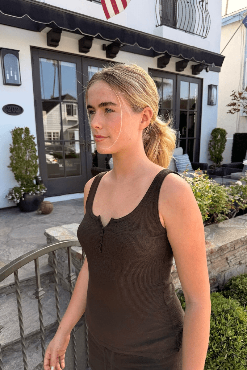 Erhöhen Sie Ihre Lässige Garderobe Mit Dem Brandy Melville Celia Tank Mocha, Einer Vielseitigen Und Stilvollen Ergänzung, Die Perfekt Für Jede Jahreszeit Ist. Dieses Weiche, Gerippte Baumwolltanktop Verfügt über Einen Schmeichelhaften Rundhalsausschnitt Und Ein Fünf-Knopf-Detail, Das Ihrem Outfit Einen Hauch Von Charme Verleiht.