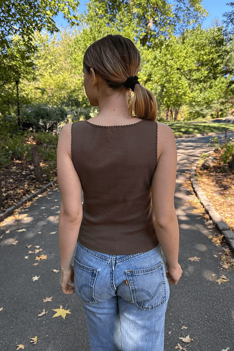Das Brandy Melville Vicki Tank Dunkelbraun Ist Ihr Lieblingsoberteil Für Mühelosen Stil. Egal, Ob Sie Sich Für Einen Abend Auskleiden Oder Es Lässig Für Einen Tag Im Park Halten, Dieses Tanktop Passt Wunderbar Zu Jeans, Shorts Oder Röcken. Das Einzigartige Gewellte Design Fügt Ein Schickes Element Hinzu, Das Sicherstellt, Dass Sie In Jeder Menge Auffallen.