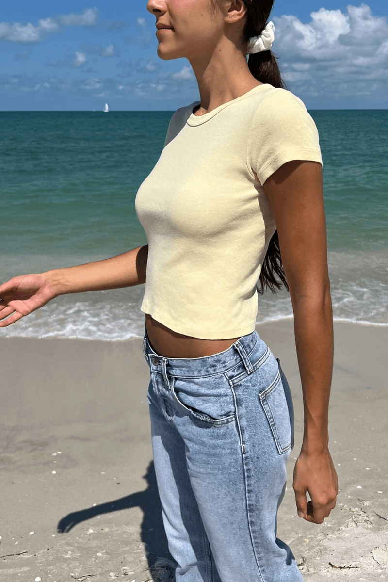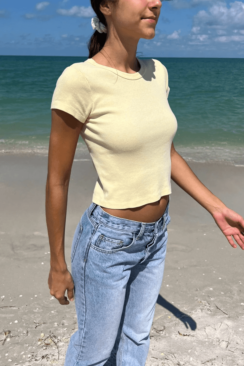 élevez Votre Garde-robe Avec Le haut Hailie De Brandy Melville Jaune Pastel, Le Mélange Parfait De Style Et De Confort. Ce T-shirt Ajusté Et Court à Manches Courtes Est Conçu Pour Faire Une Déclaration Tout En Vous Gardant élégante Sans Effort.