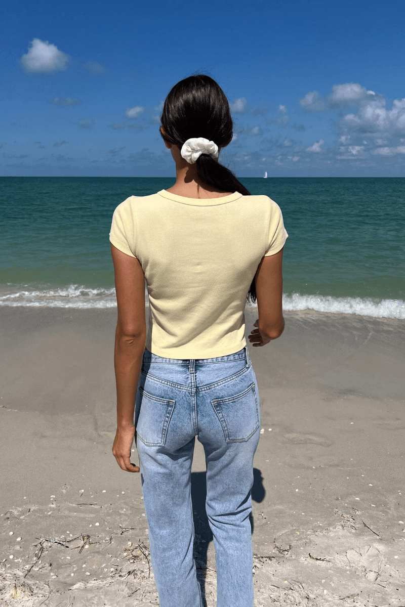 ne Manquez Pas D'ajouter Le haut Hailie De Brandy Melville Jaune Pastel à Votre Garde-robe Aujourd'hui ! Cliquez Sur Le Bouton Ci-dessous Pour Magasiner Maintenant Et Adoptez Un Style Sans Effort !