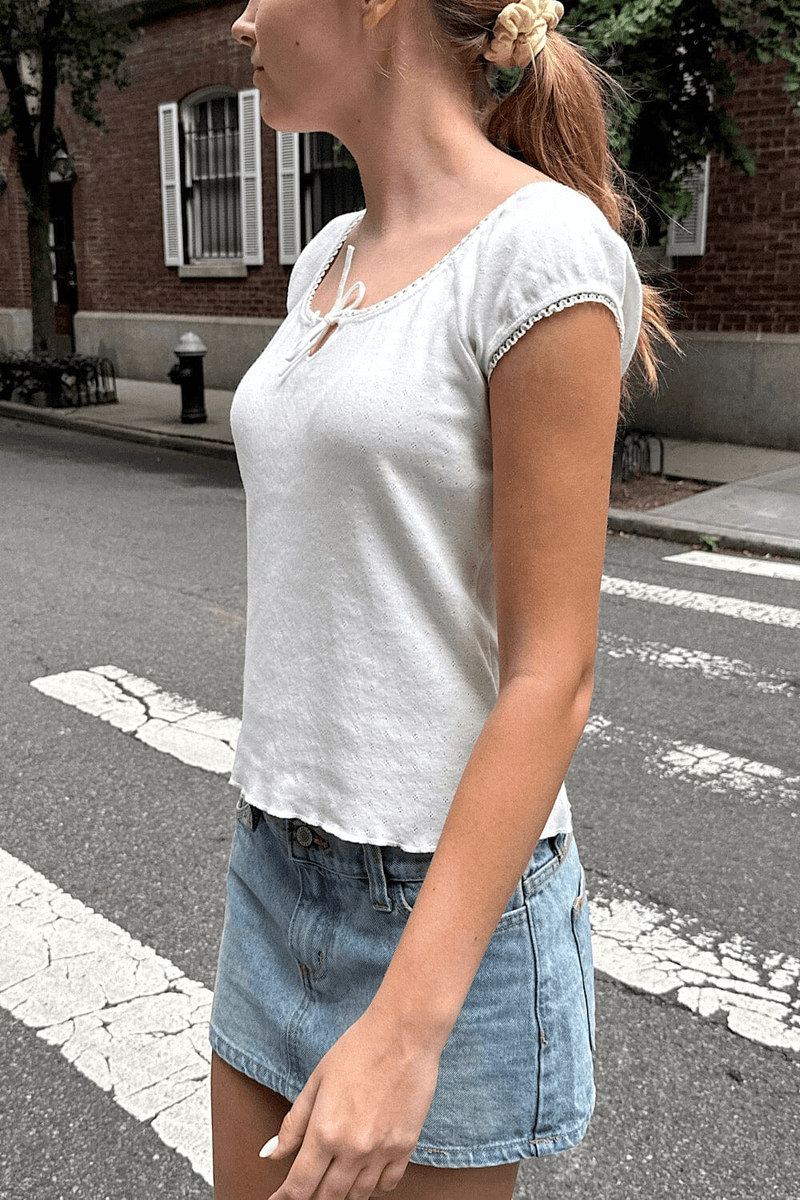 a brandy Melville Noa Eyelet Top Fehér Azok Számára Készült, Akik értékelik A Divatot és A Kényelmet. A Fűzött Rövid Ujjak Finom érintést Adnak, így Ideális Nyári Kirándulásokhoz Vagy Laza összejövetelekhez. A 14" (36 Cm) Mellbőség Méretével Ez A Testhezálló Felső Különböző Testtípusokat Előnyösen Kiemel, és Gyönyörűen Mutat Zakók Vagy Kardigánok Alatt Réteges Megjelenéshez.