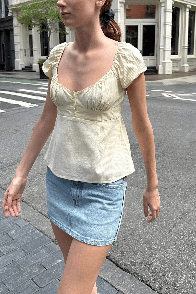 brandy Melville Blair Top Berwarna Kuning Pastel Lebih Dari Sekadar Atasan Dasar; Ini Adalah Pakaian Pernyataan Yang Dapat Dipadukan Dengan Jeans Favorit Anda Atau Rok Yang Stylish. Detail Ruffle Menambah Sentuhan Ceria, Sementara Bagian Depan Yang Berkancing Memberikan Tampilan Yang Rapi. Kain Katun Ringan Memastikan Sirkulasi Udara, Menjadikannya Sempurna Untuk Hari-hari Hangat Atau Sebagai Lapisan Di Bulan-bulan Yang Lebih Dingin.