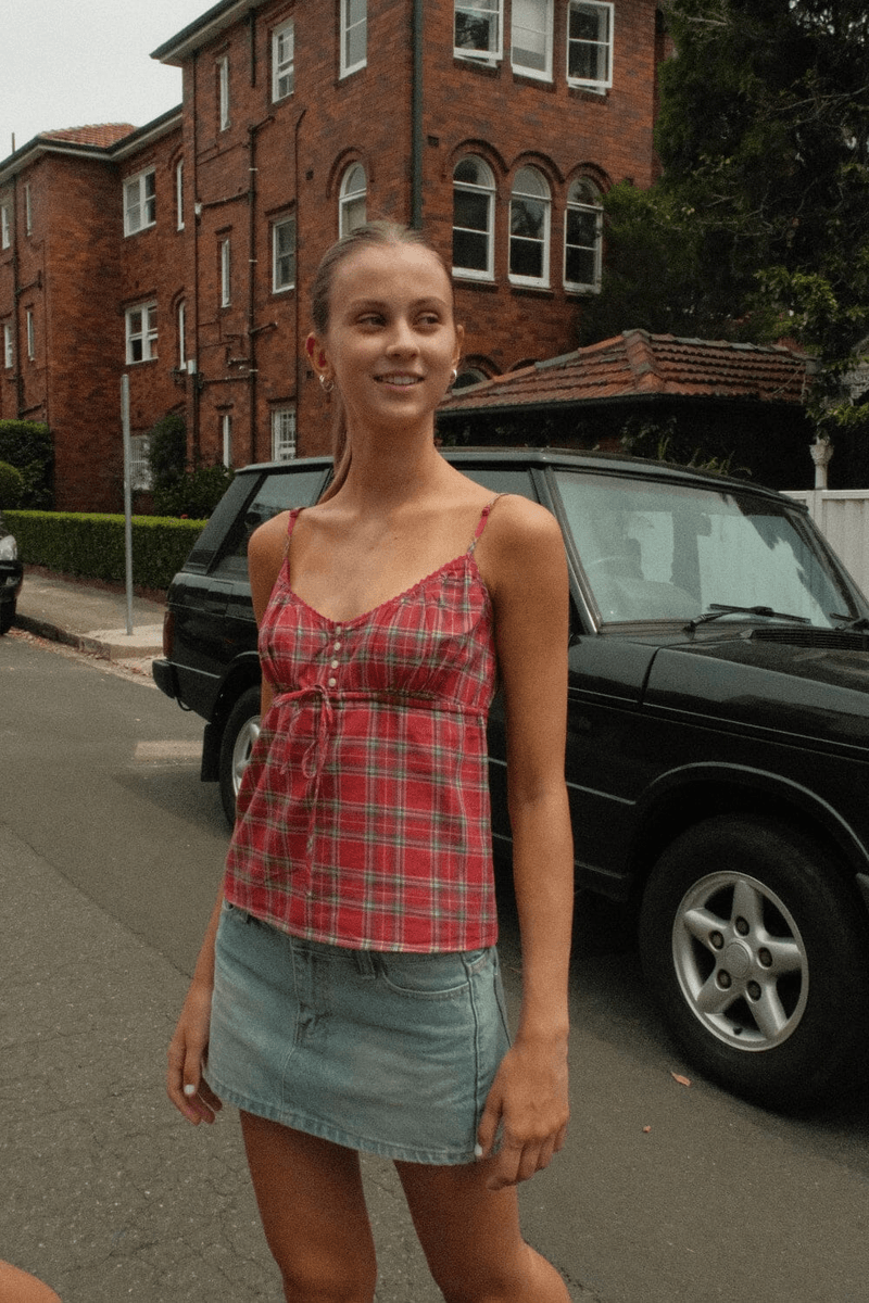 Brandy Melville Tiffany Plaid Tank Merah Dengan Pola Kotak Hitam Dan Coklat