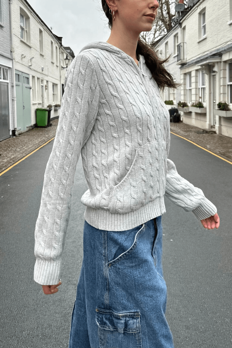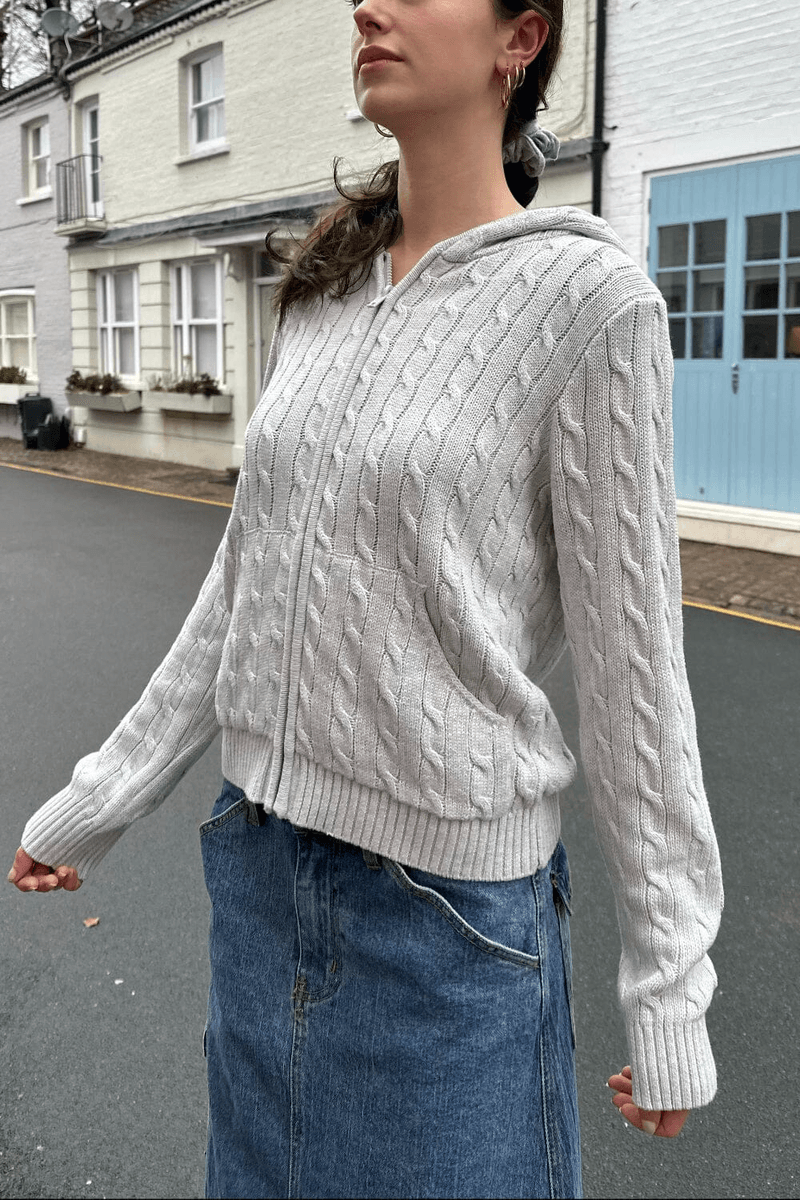 tingkatkan Lemari Pakaian Anda Dengan brandy Melville Ayla Cable Knit Zip-up Sweater Yang Menakjubkan Dalam Abu-abu Perak. Potongan Bergaya Ini Menggabungkan Kenyamanan Dan Fleksibilitas, Menjadikannya Barang Yang Wajib Dimiliki Bagi Setiap Penggemar Mode.