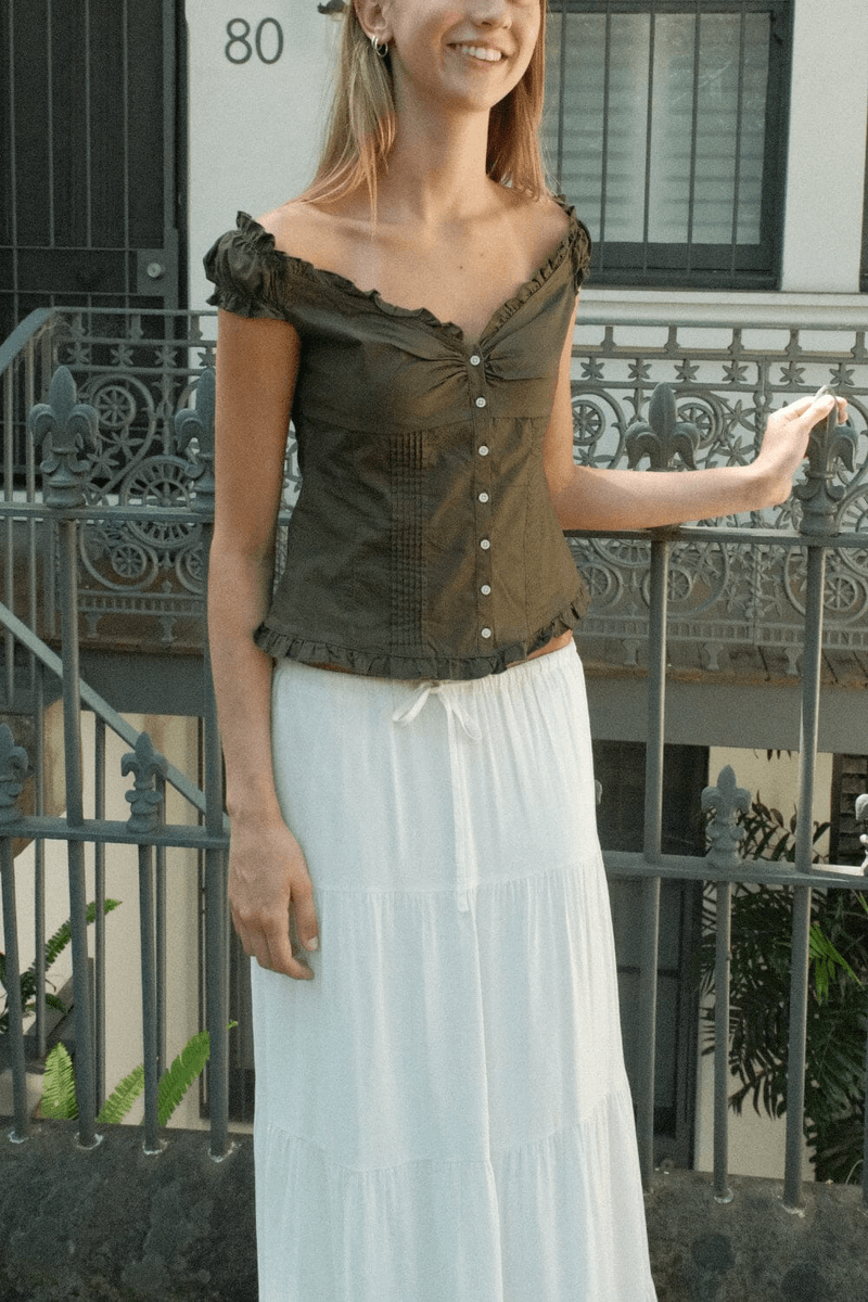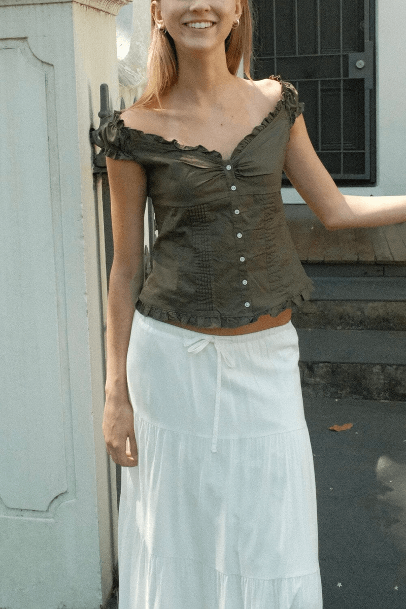 tingkatkan Lemari Pakaian Anda Dengan brandy Melville Elena Top Hijau Militer Yang Stylish. Atasan Button-up Yang Chic Ini Memiliki Leher V Elastis Dan Detail Ruffle Yang Menawan, Menjadikannya Tambahan Yang Serbaguna Untuk Setiap Outfit. Sempurna Untuk Acara Santai Atau Layering, Atasan Ini Menggabungkan Kenyamanan Dan Gaya Dengan Mudah.