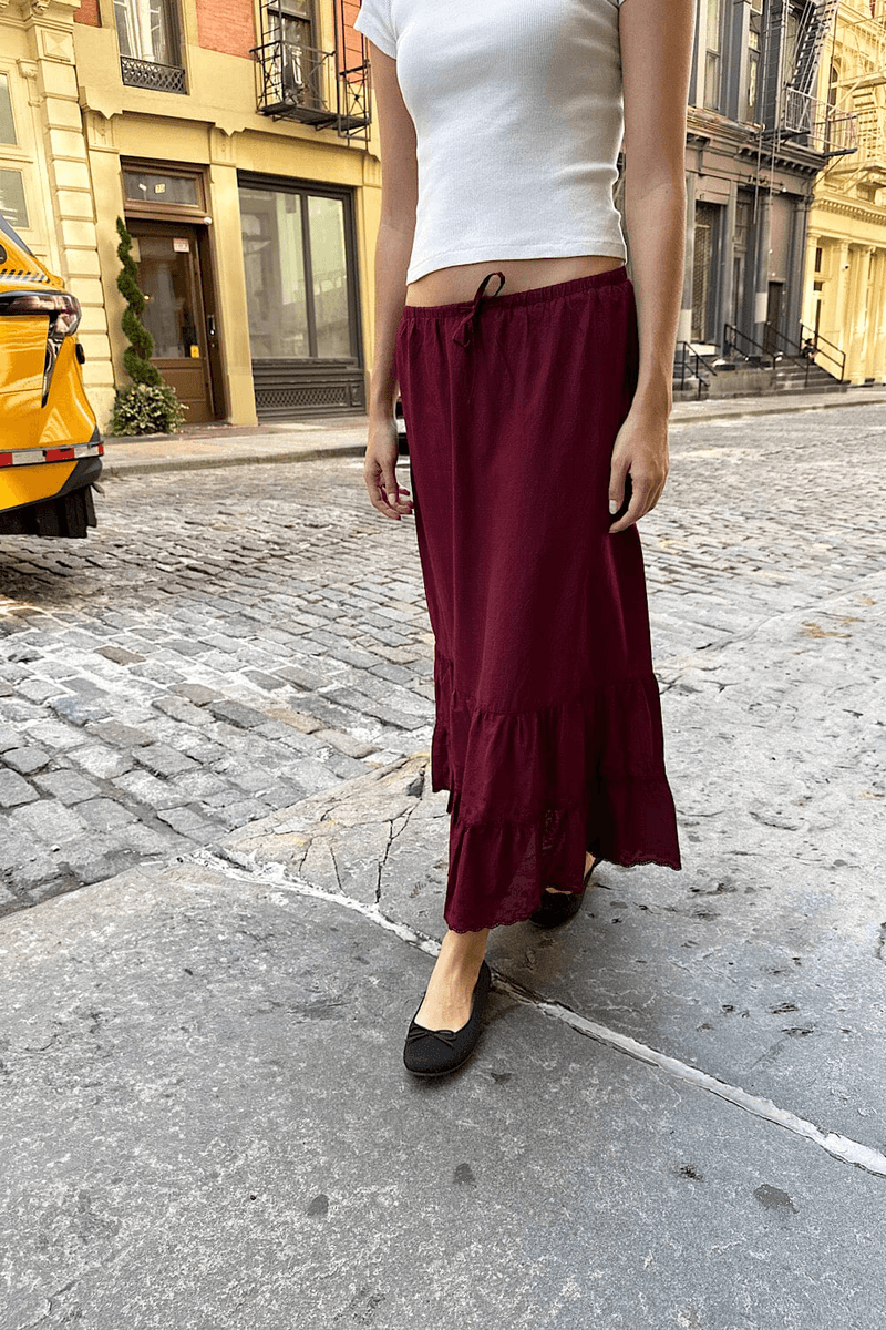 eleva Il Tuo Guardaroba Con La Stunning gonna Oliva Brandy Melville Bordeaux. Questa Gonna Lunga E Fluida Combina Eleganza E Comfort, Rendendola L'aggiunta Perfetta A Qualsiasi Outfit. Con Il Suo Ricamo Intricato E Il Design Chic, Attirerai L'attenzione Ovunque Tu Vada.