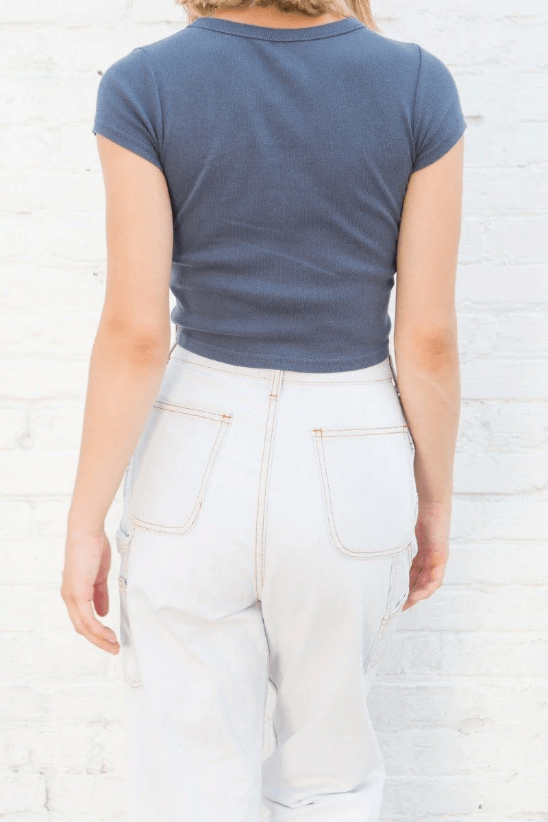 il top Hailie Di Brandy Melville Blu Navy Sbiadito Presenta Un Taglio Corto E Alla Moda Con Maniche Corte, Rendendolo Una Scelta Ideale Per Ogni Stagione. Con Una Lunghezza Di 17" (41 Cm) E Una Misura Del Busto Di 13" (33 Cm), Questo Top è Progettato Per Adattarsi Perfettamente Mentre Offre Comfort E Traspirabilità. Abbinalo A Jeans A Vita Alta O A Una Gonna Fluida Per Un Outfit Trendy Che Si Fa Notare.
