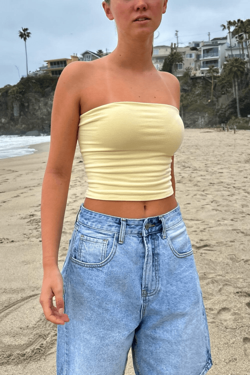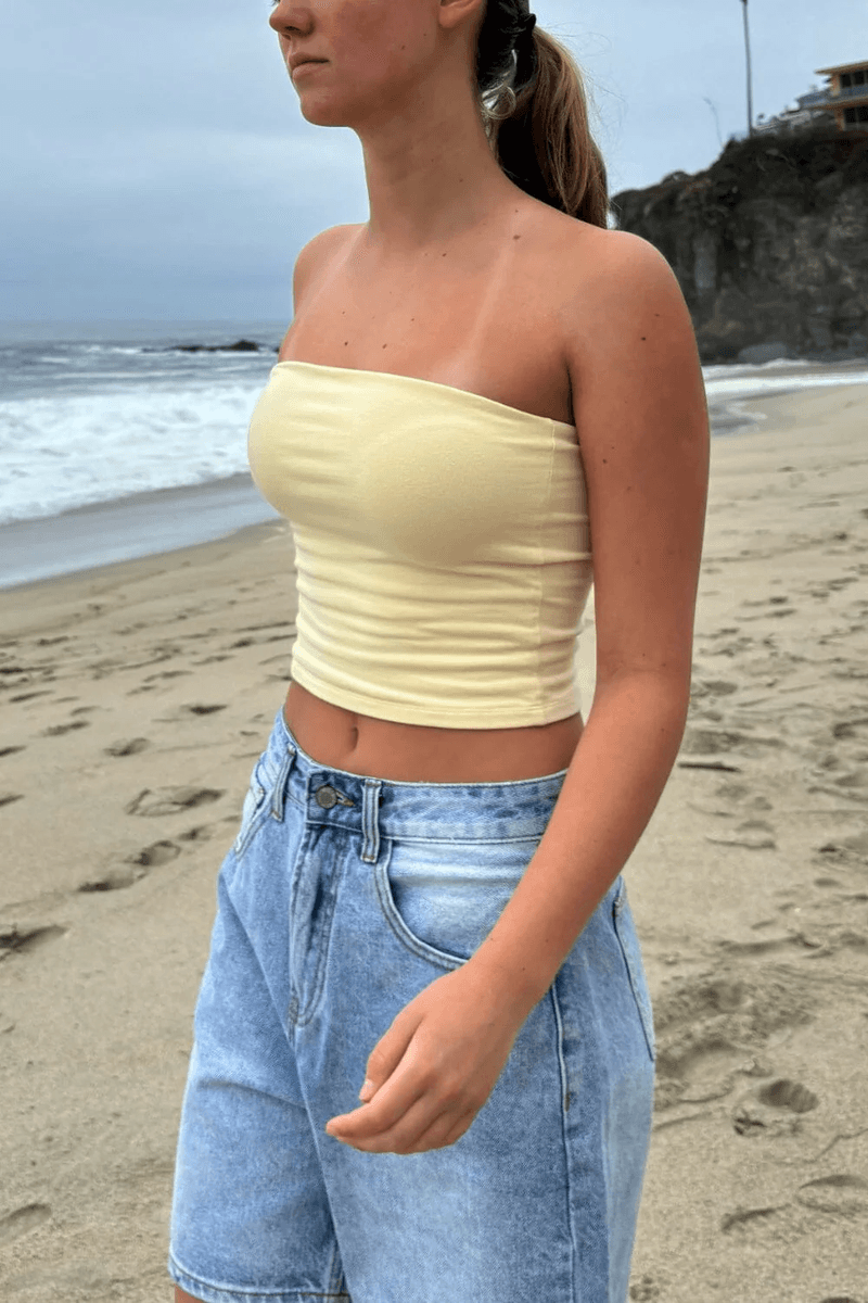 pakelkite Savo Garderobą Su brandy Melville Amelia Crop Top Pastelinėje Geltonoje. šis Nuostabus Be Petnešėlių Crop Top'as Sujungia Komfortą Ir Stilių, Todėl Jis Yra Būtinas Kiekvienam Mados Mylėtojui.