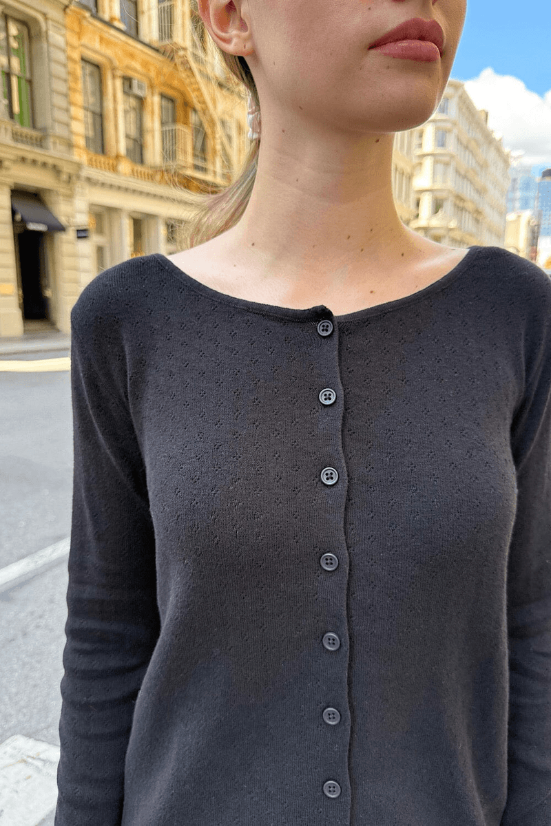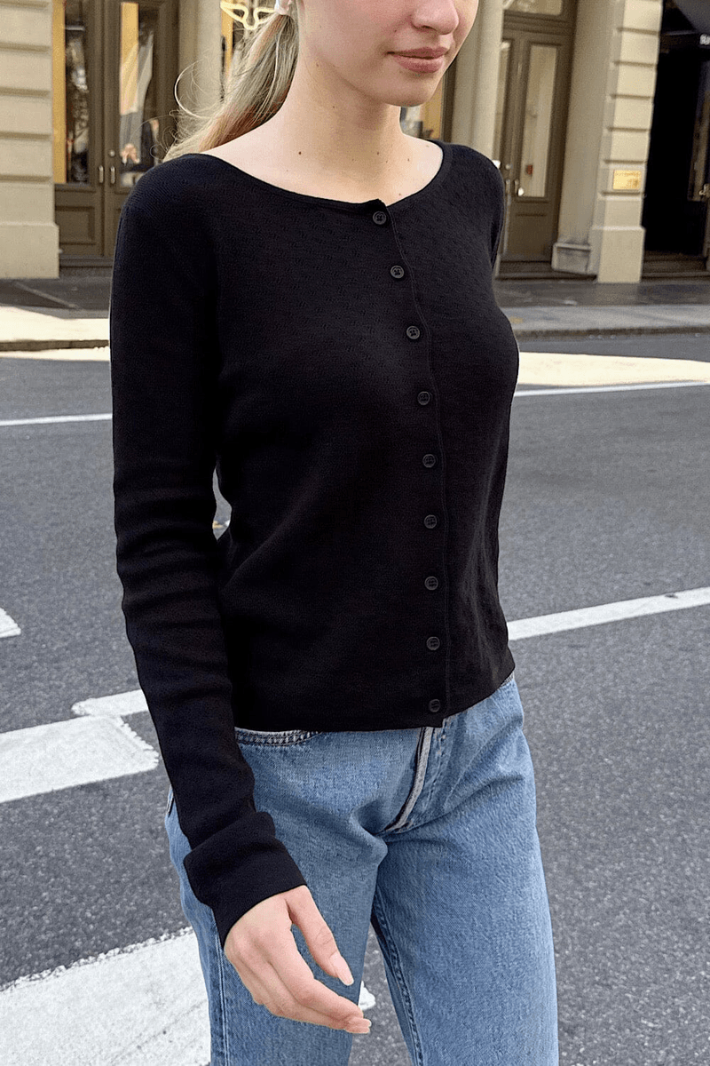 paaugstiniet Savu Garderobi Ar Apbrīnojamo brandy Melville Athelia Eyelet Top Melnā Krāsā. Izgatavots No 100% Kokvilnas, šis Stilīgais Pogājams Garo Piedurkņu Adījums Apvieno Komfortu Un Stilu Bez Piepūles. Ideāli Piemērots Jebkurai Reizei, Tas Ir Obligāts Gabals Modes Priekšā Stāvošiem Cilvēkiem.