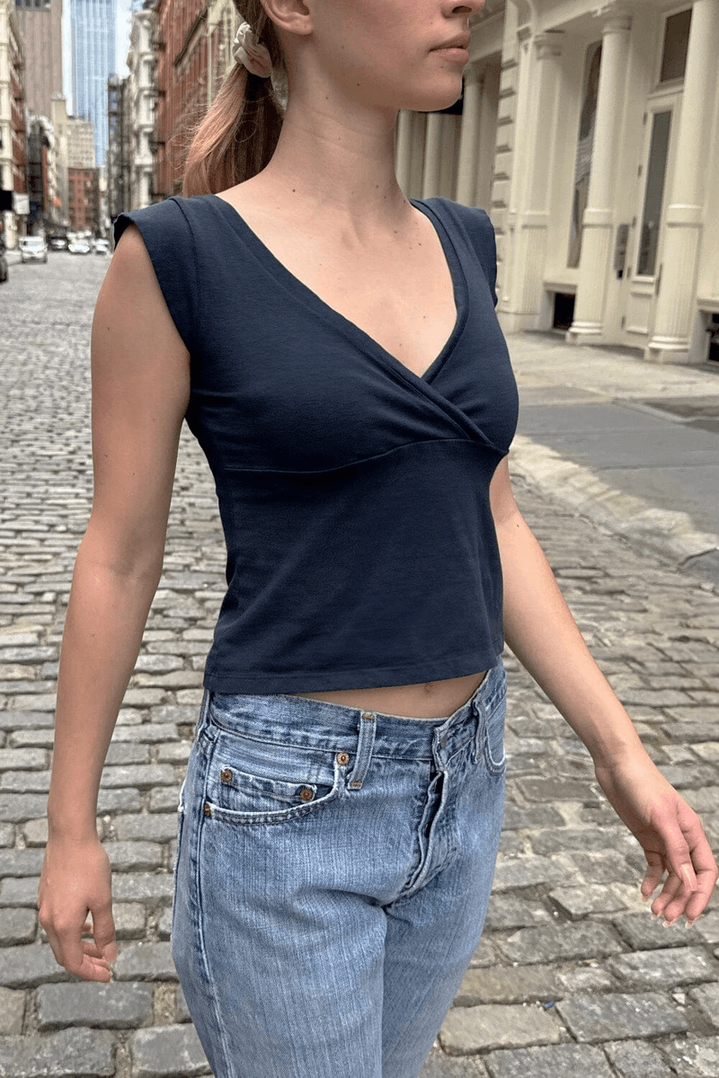 verhoog Je Garderobe Met De Stijlvolle brandy Melville Amara Tank Marineblauw. Dit Chique Tanktop Is Perfect Voor Die Warme Dagen Waarop Je Moeiteloos Fashionable Wilt Zijn. Met Zijn Unieke Crossover Ontwerp En Gegolfde V-hals, Combineert Het Comfort En Elegantie Naadloos.