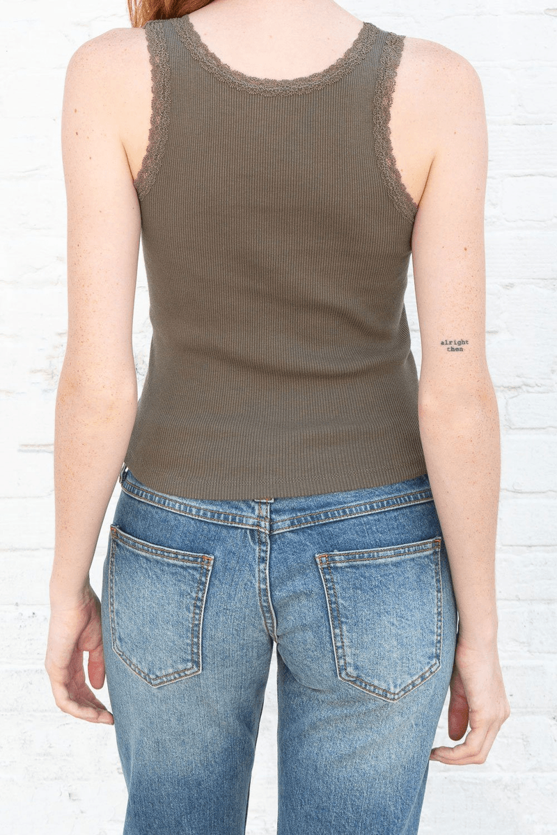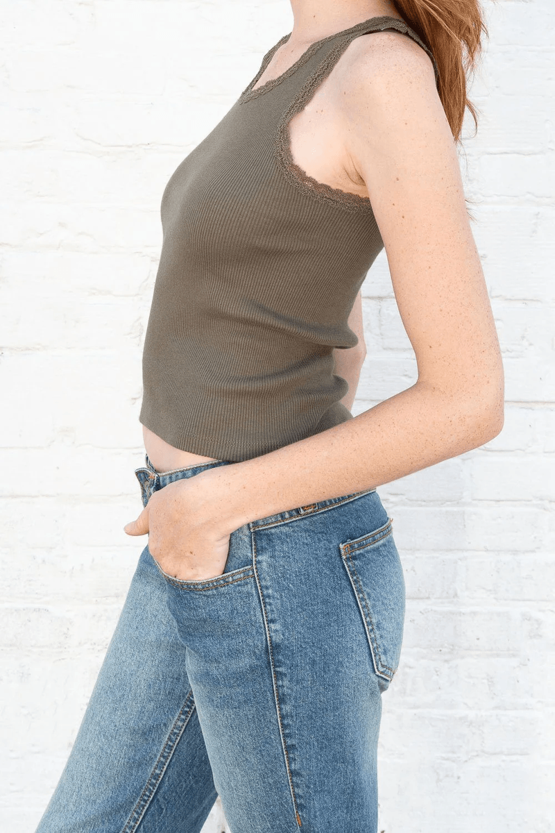 mis Deze Essentiële Stuk Niet! shop De Brandy Melville Ronnie Rib Lace Tank In Olijfgroen Vandaag Nog En Transformeer Je Garderobe Met Moeiteloze Stijl.