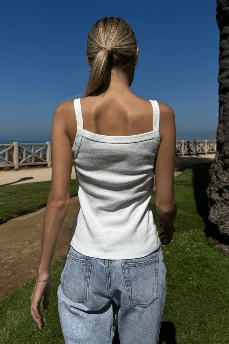 brandy Melville Belle Tank Hvit Er Designet For å Være Din Favoritt Topp For Enhver Sesong. Med Sin Klassiske Firkantede Utringning Og Tykk Kant Langs Halsen, Tilbyr Denne Tanken En Unik Vri På En Tidløs Stil. Den Tettsittende Designen Omfavner Kroppen Din På Alle De Riktige Stedene, Og Sikrer At Du Føler Deg Trygg Og Stilig.