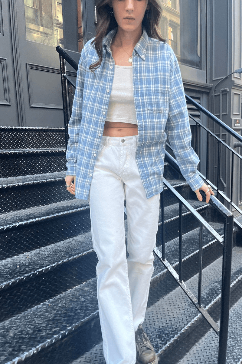 podnieś Swoją Codzienną Garderobę Dzięki koszuli Flanelowej Brandy Melville Hazel, Zaprojektowanej W Oszałamiający Wzór W Niebiesko-białą Kratę. Ta Koszula Z Długim Rękawem I Zapięciem Na Guziki Jest Idealna Do Noszenia Na Cebulkę Lub Samodzielnie, Co Czyni Ją Wszechstronnym Dodatkiem Do Twojej Kolekcji.