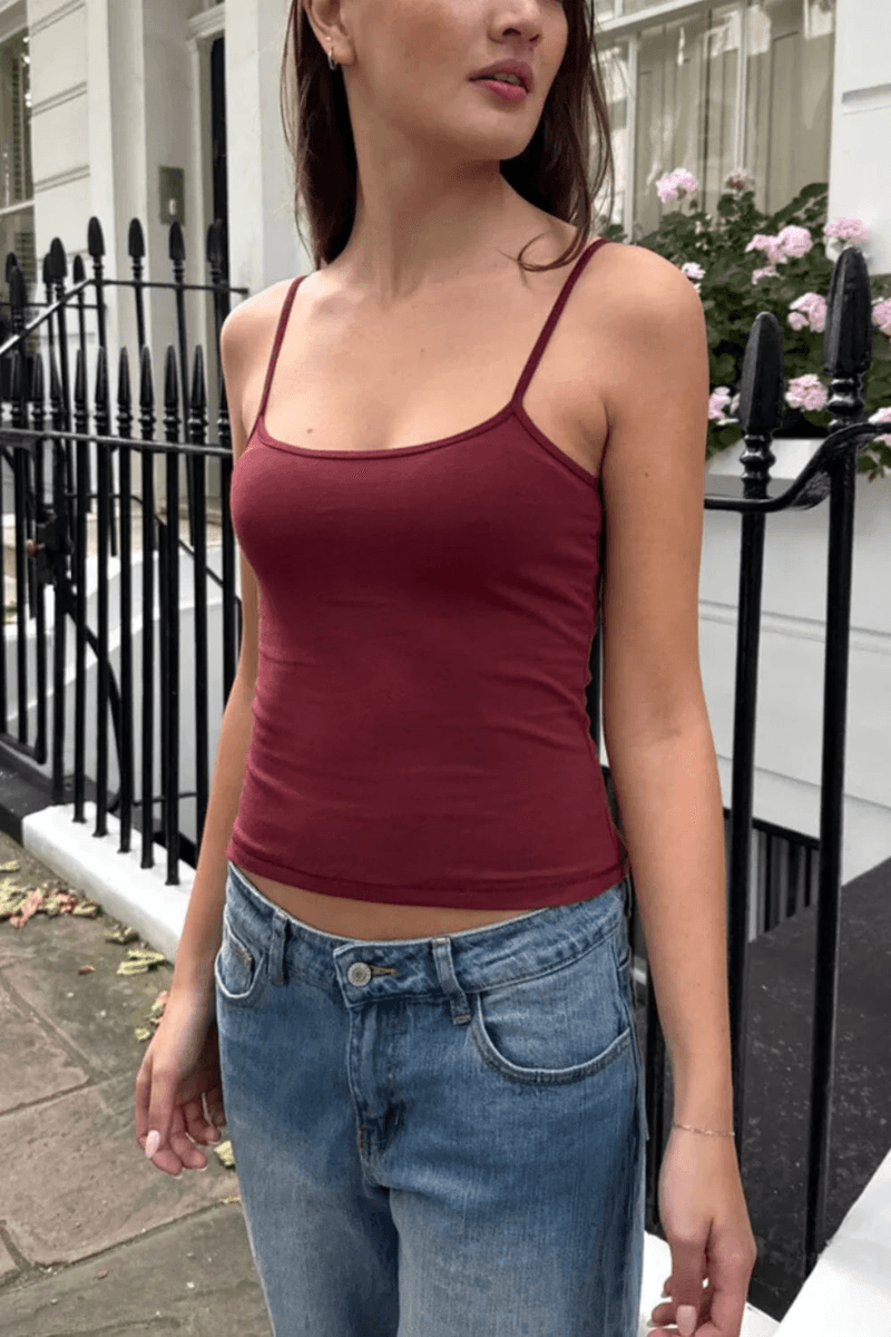 ten Top Tank To Nie Tylko Podstawowy Element; To Kluczowy Element Garderoby, Który Można Stylizować Na Różne Okazje. Dzięki Bogatemu Burgundowemu Odcieniowi Dodaje Koloru Do Twojego Stroju, Co Czyni Go Idealnym Wyborem Na Wszystko, Od Codziennych Wyjść Po Relaksujące Wieczory.
