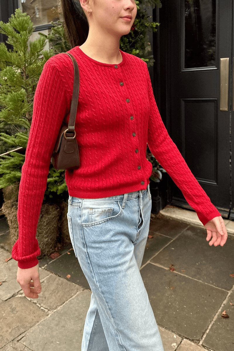 kardigan Z Dzianiny Warkoczowej Brandy Melville Zoe W Kolorze Czerwonym Jest Wykonany Z Wysokiej Jakości 100% Bawełny, Co Zapewnia Miękkie I Oddychające Dopasowanie. O Długości 19 Cali (47 Cm) I Obwodzie Biustu 32 Cale (82 Cm), Ten Kardigan Jest Zaprojektowany, Aby Zapewnić Korzystny Kształt Sylwetki.