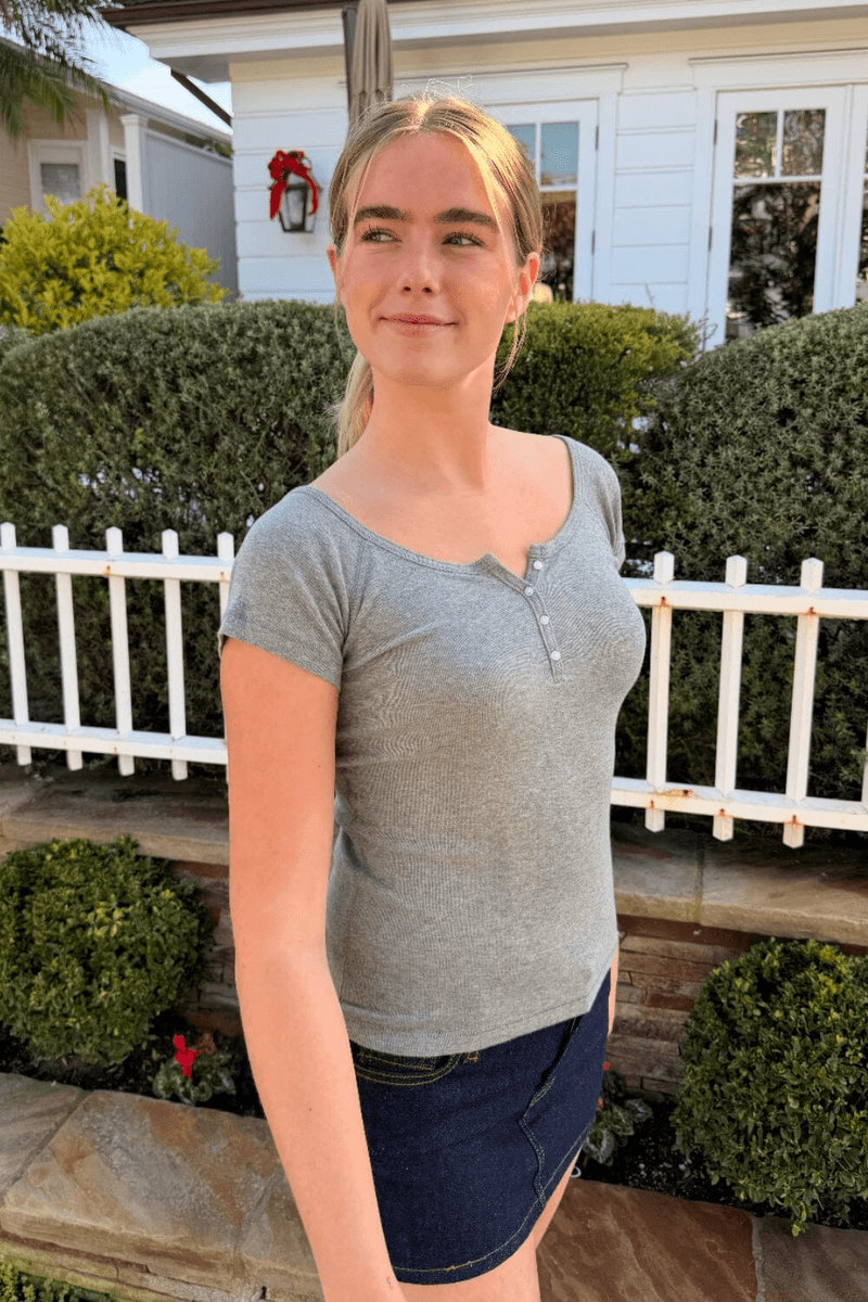 eleve Seu Guarda-roupa Com O top Zelly Da Brandy Melville Cinza Ash. Este Elegante Top Ajustado De Manga Curta Incorpora Um Estilo Descomplicado, Perfeito Para Qualquer Saída Casual Ou Dia Relaxante Em Casa.