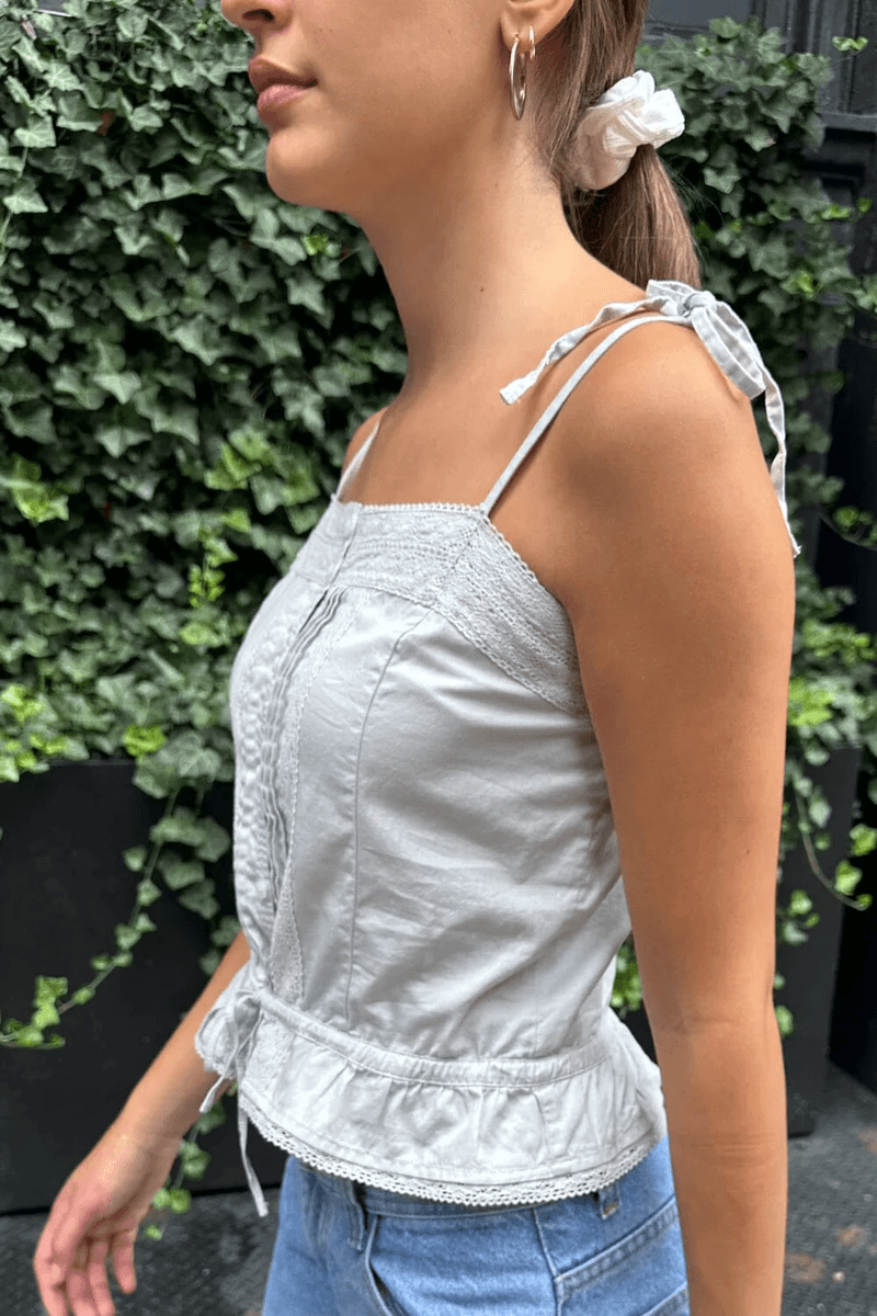 topul brandy Melville Maeve Albastru Prăfuit Are Un Design Chic Cu Bretele Legate Care Permit O Ajustare Personalizată. Având O Lungime De 19" (48cm) și O Circumferință A Bustului De 13" (33cm), Acest Top Este Realizat Din Materiale Premium Pentru A Asigura Durabilitate și Confort. Ideal Pentru O Zi în Oraș Sau O Seară Casuală, Acest Top Versatil Poate Fi Asortat Cu Blugi, Fuste Sau Pantaloni Scurți Pentru Un Look Complet.