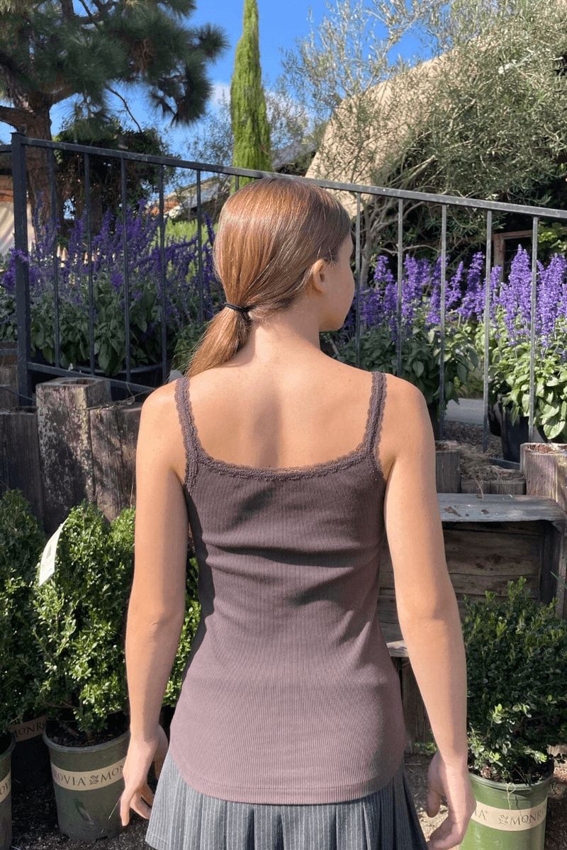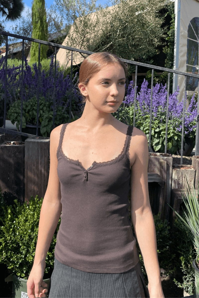 brandy Melville Amaya čipkový Top Mocha Má Dĺžku 15" A Obvod Hrudníka, čo Z Neho Robí Lichotivý Strih Pre Rôzne Typy Postavy. či Už Je Spárovaný S Nohavicami S Vysokým Pásom Alebo Vrstvený Pod útulným Kardigánom, Tento Top Je Nevyhnutným Základným Kúskom Vo Vašom šatníku. Vyrobené V Taliansku, Odráža Záväzok K Kvalite A štýlu.