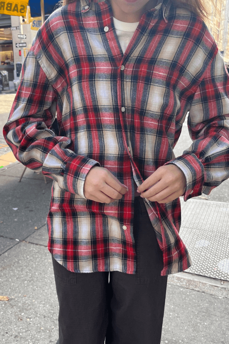 pozdvihnite Svoj Neformálny šatník S flanelovou Blúzkou Brandy Melville Hazel V Ohromujúcej červenej, Námorníckej A Slonovinovej Kárované Vzore. Táto Košeľa S Dlhým Rukávom A Gombíkmi Je Dokonalou Kombináciou Pohodlia A štýlu, čo Z Nej Robí Nevyhnutný Kúsok Pre Každého Módneho Nadšenca.