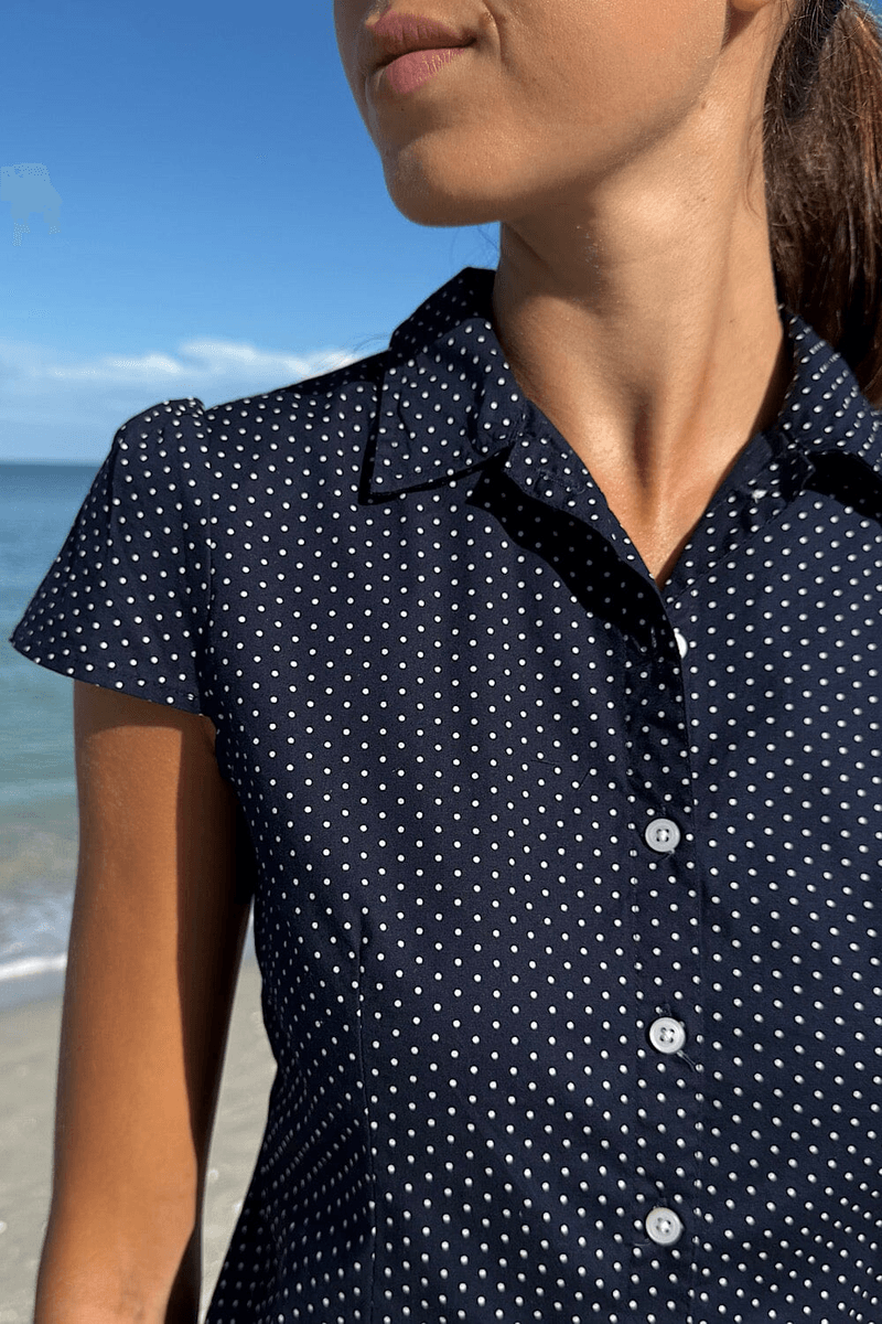 brandy Melville Rue Polka Dots Top Je Navrhnutý S Klasickým Golierom, štýlovými Gombíkmi A Krátkymi Rukávmi, Ponúkajúci Lichotivý úzky Strih, Ktorý Zvýrazňuje Vašu Siluetu. Vyrobený Z 95% Bavlny A 5% Spandexu, Poskytuje Presne To Správne Množstvo Pružnosti Pre Pohodlné Nosenie. S Dĺžkou 23" (58cm) A Obvodom Hrudníka 16" (41cm) Je Tento Top Navrhnutý Tak, Aby Krásne Sedel Na Rôznych Typoch Postavy.