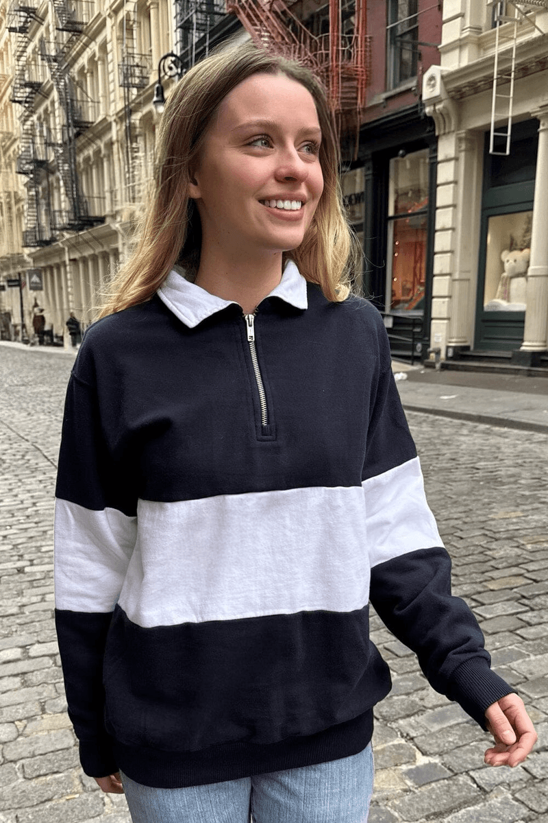 mikina Brandy Melville Isabella Námornícka Modrá Je Navrhnutá Pre Tých, Ktorí Si Cenia Pohodlie Aj Módu. Vzor Farebných Blokov Pridáva Jedinečný Nádych K Vášmu Ležérnemu Vzhľadu, čo Ho Robí Univerzálnym Na Vrstvenie Alebo Nosenie Samostatne. či Už Idete Na Rannú Kávu Alebo Sa Len Tak Povaľujete Doma, Táto Mikina Je Vaším Obľúbeným Kúskom.