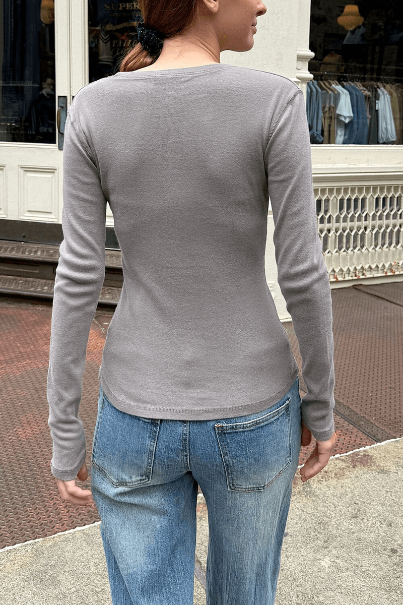 pozdvihnite Svoj šatník S topom Brandy Melville Ainsley Tmavo šedým, Nevyhnutným Základným Dlhým Rukávom S Okrúhlym Výstrihom, Ktorý Je Ideálny Na Akékoľvek Ročné Obdobie. Tento Všestranný Kúsok Bez Námahy Kombinuje Pohodlie A štýl, čo Z Neho Robí Nevyhnutný Doplnok Vašej Zbierky.