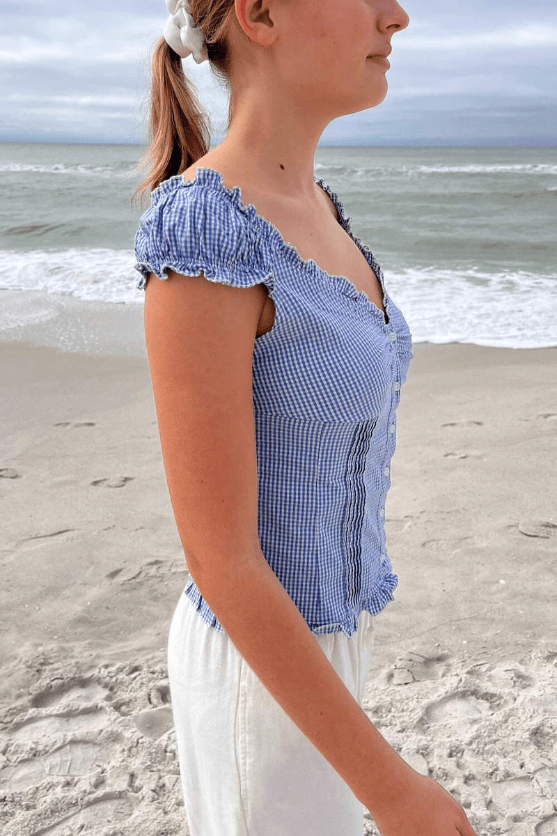 pozdvihnite Svoj šatník S brandy Melville Elena Kockovaným Topom. Tento Trendy Modro-biely Kockovaný Top Kombinuje Pohodlie A štýl, čo Z Neho Robí Nevyhnutnosť Pre Každého, Kto Sleduje Módne Trendy. Ideálny Na Neformálne Výlety Alebo Oblečený S Doplnkami, Tento Všestranný Kúsok Je Navrhnutý Tak, Aby Urobil Dojem.