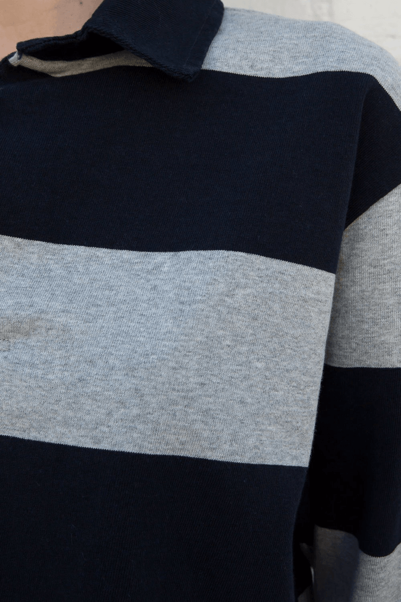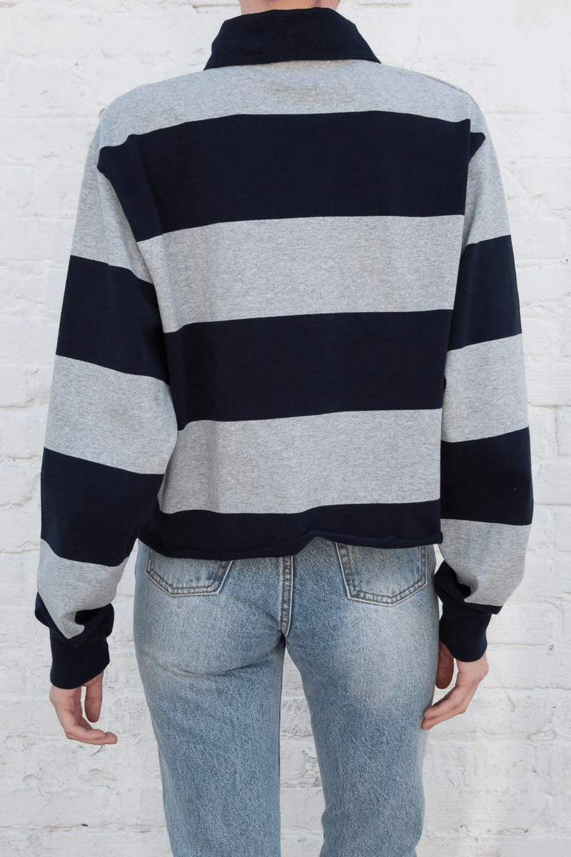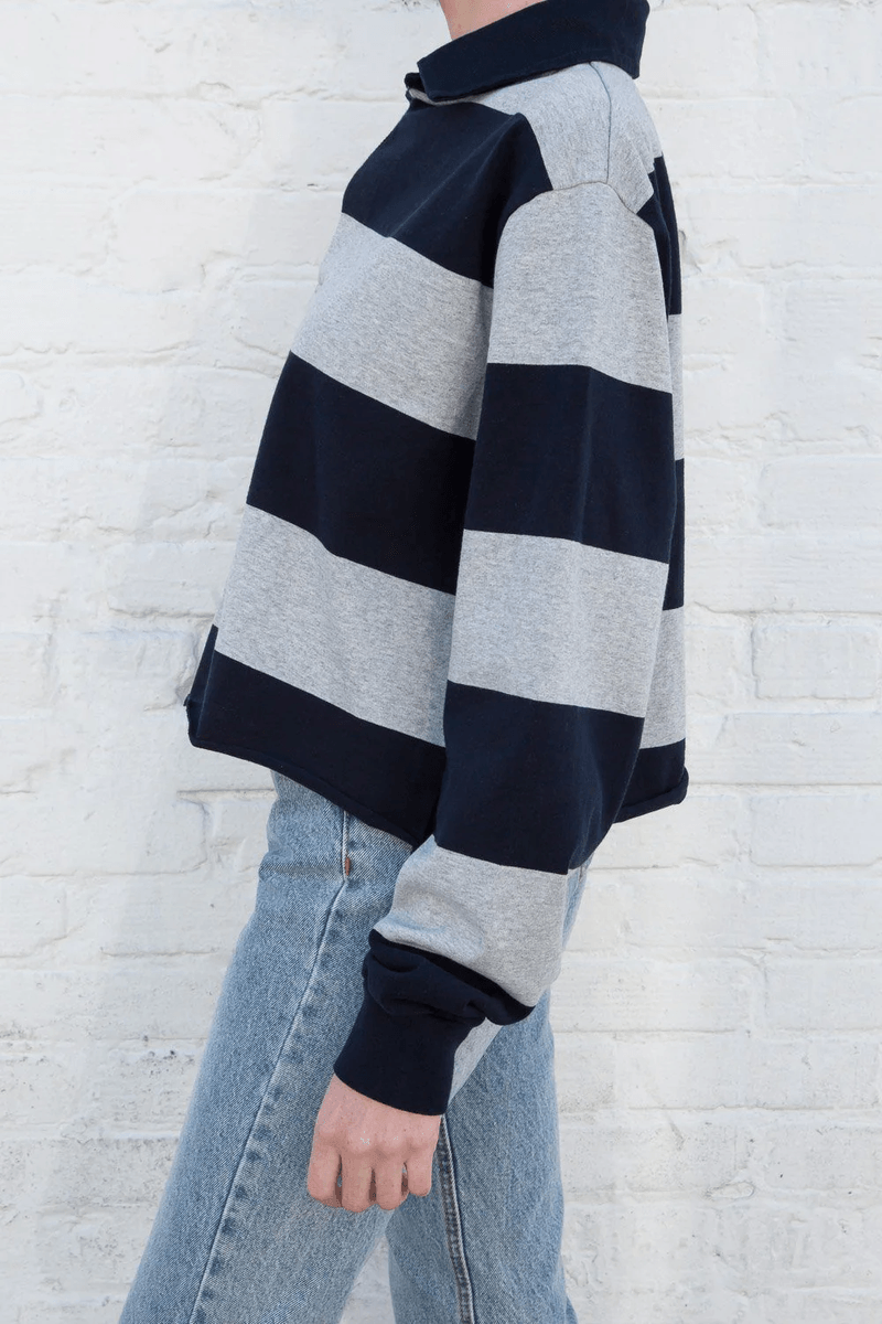 otkrijte Savršenu Kombinaciju Stila I Udobnosti Sa brandy Melville Evelyn Thick Stripe Top U Sivoj I Mornarskoj Plavoj Boji. Ovaj šik Top Sa Dugim Rukavima Ima Klasičan Dizajn Sa Kragnom Koji Bez Napora Podiže Svaku Kombinaciju, čineći Ga Neophodnim Dodatkom Vašoj Garderobi.