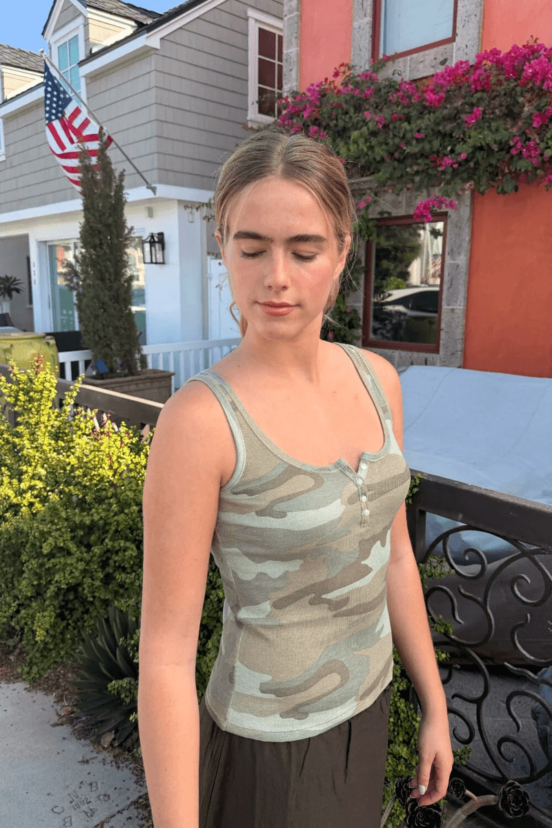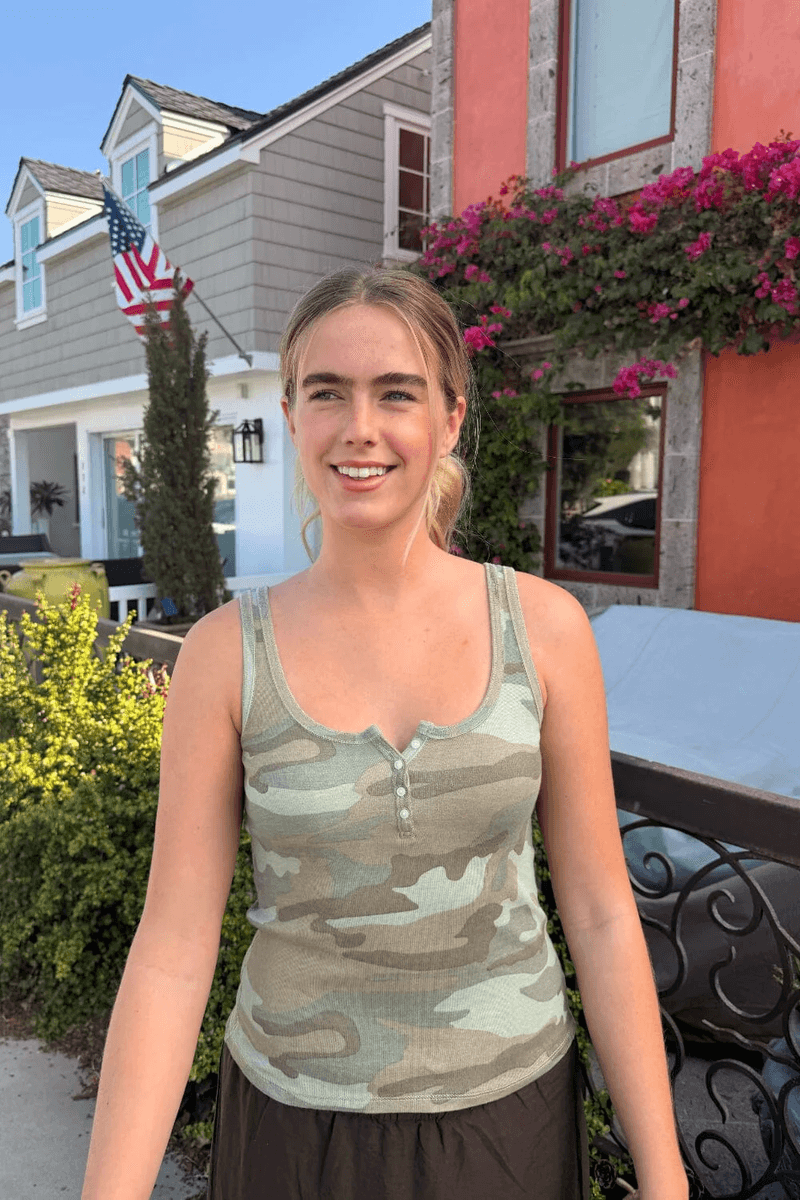brandy Melville Dalis Tank Light Camouflage är Inte Bara En Tank; Det är Ett Statementsplagg! Dess Lätta Tyg Gör Den Perfekt För Varma Dagar Eller För Att Bära Under En Jacka På Svalare Kvällar. De Ribbade Detaljerna Ger Textur, Medan Det Eleganta Kamouflage-mönstret Håller Din Look Avslappnat Stilren.