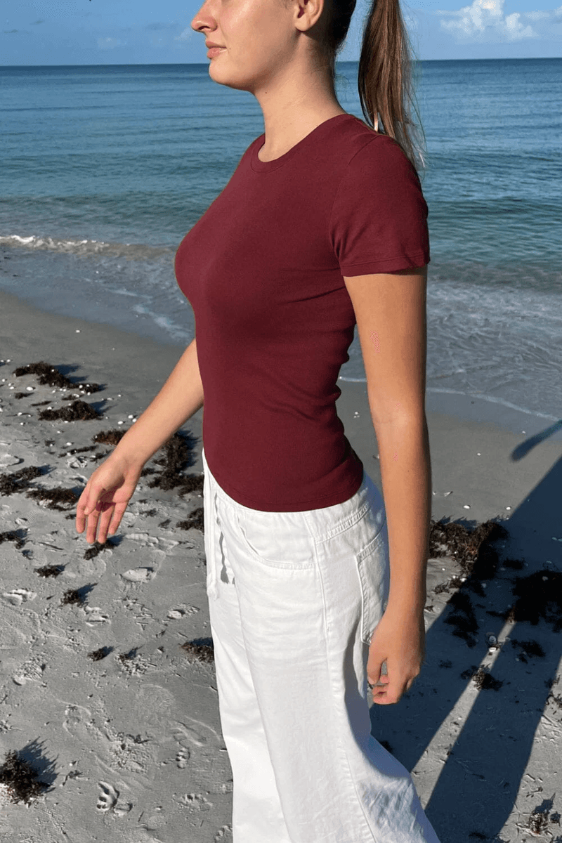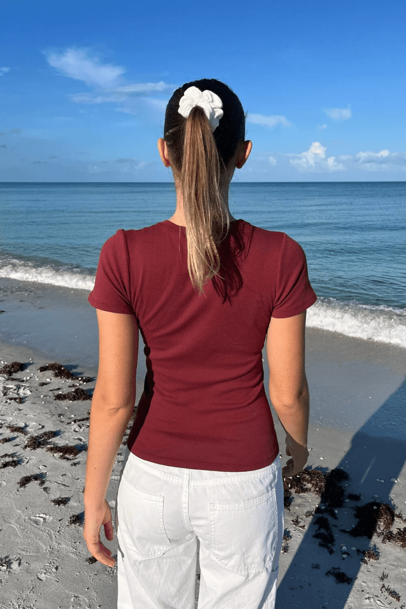 brandy Melville Chloe Toppen I Burgundy är Inte Bara En Topp; Det är Ett Statementsplagg Som Sömlöst Blandar Komfort Och Stil. Tillverkad Av 100% Bomull, Känns Denna Topp Mjuk Mot Din Hud Samtidigt Som Den Ger Andningsförmåga. Oavsett Om Du Kombinerar Den Med Högmidjade Jeans För En Avslappnad Dag Ute Eller Lager-på-lager Under En Chic Jacka För En Kvällslook, Levererar Denna Topp Mångsidighet.