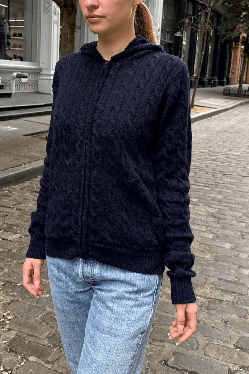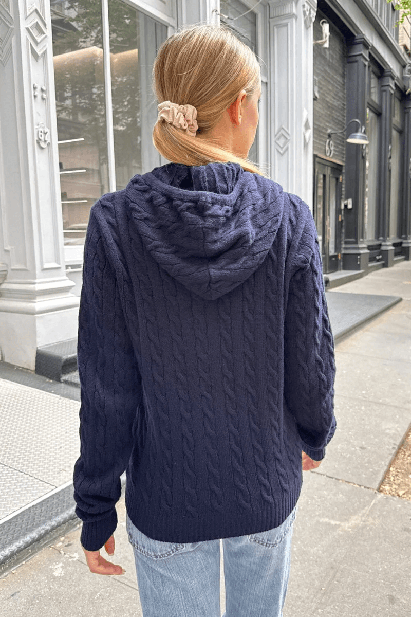 Elevate your wardrobe with the Brandy Melville Ayla Cable Knit Sweater. This stylish navy blue zip-up sweater offers a blend of comfort and chic sophistication, making it a must-have for any fashion-forward individual.
