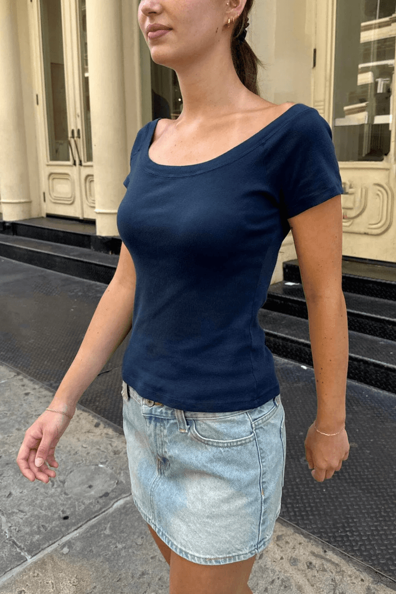 Elevate your wardrobe with the stunning Brandy Melville Ginny Top Navy. This chic, fitted top is designed to make a statement, perfect for both casual outings and stylish gatherings. With its off-the-shoulder silhouette and elegant boat neck, it effortlessly blends comfort and sophistication.