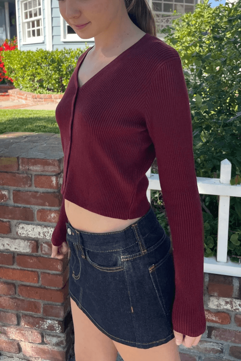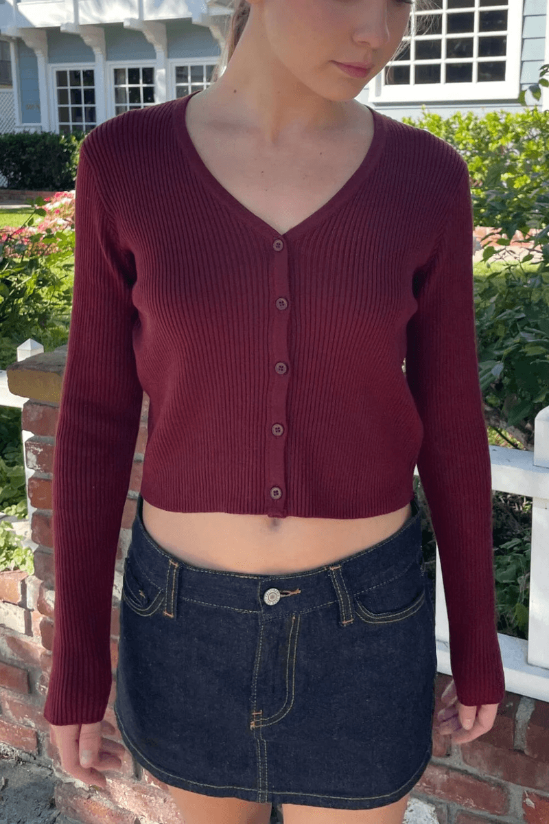 gardırobunuzu brandy Melville Shannon Kazak Bordo Ile Yükseltin, Hafif Ribana örme Düğmeli Hırka. Katmanlama Için Mükemmel Olan Bu şık Parça, Konfor Ve Zarafeti Zahmetsizce Bir Araya Getiriyor.