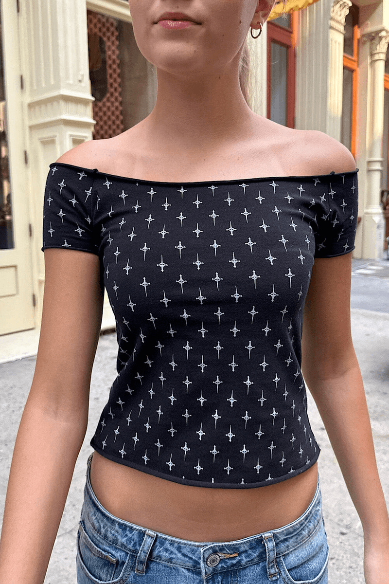 stilinizi brandy Melville Bonnie Dagger üst Ile Yükseltin, çarpıcı Beyaz Dagger Baskısı Ile Siyah. Bu Omuzdan Askılı Crop Top, Konfor Ve Trendin Mükemmel Karışımını Sunarak, Her Moda Tutkununun Gardırobunda Bulunması Gereken Bir Parça Haline Geliyor.