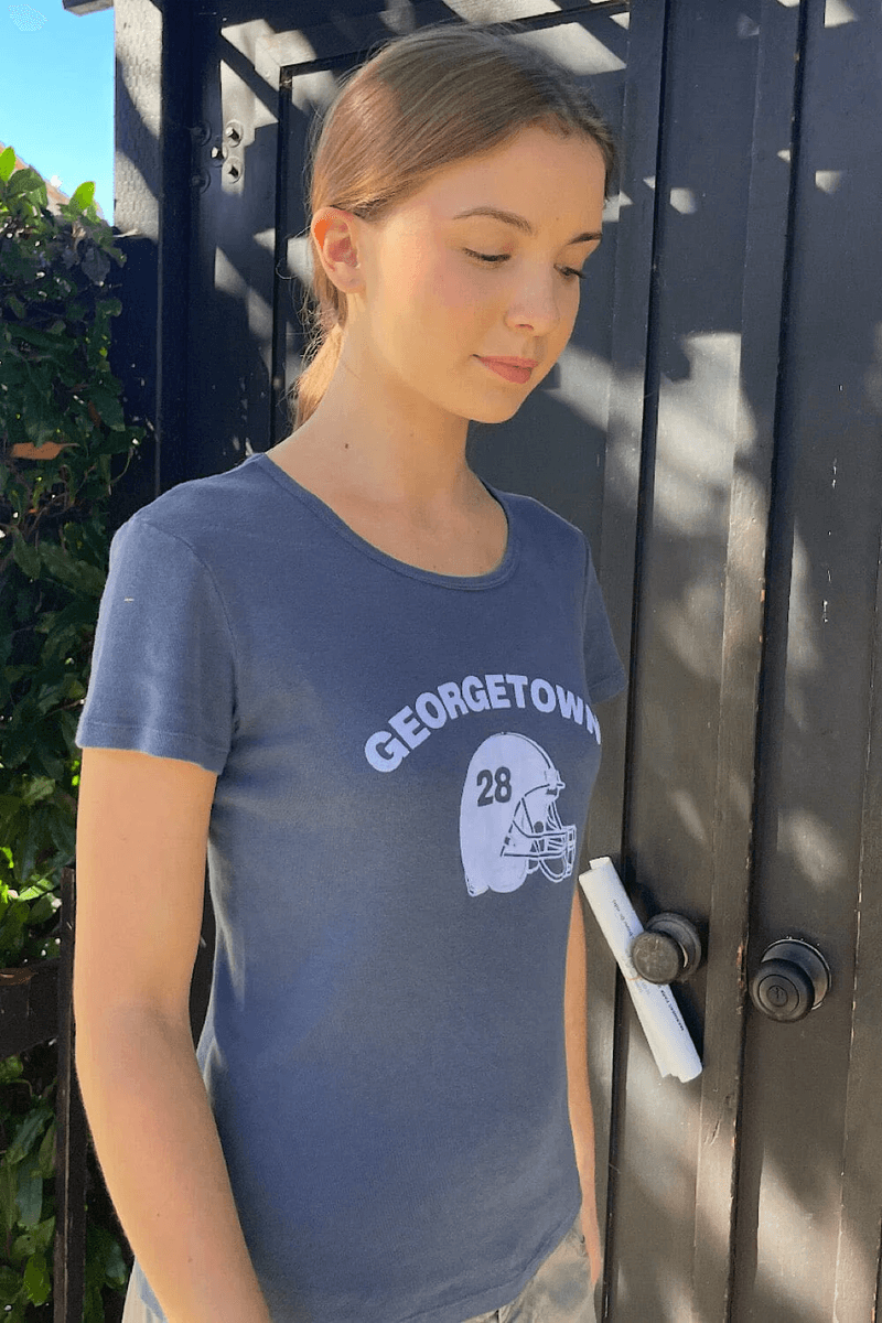 brandy Melville Hailie Georgetown üstü Sadece Başka Bir Tişört Değil; Benzersiz Stilinizi Sergileyen Bir Ifade Parçasıdır. Dikkat çekici Soluk Mavi Rengi Ve Cesur Georgetown Grafiği Ile Bu Tişört Her Kalabalıkta öne çıkıyor. Rahat Kesimi Ve Kısa Kolları, Katmanlama Için Veya Daha Sıcak Aylarda Tek Başına Giymek Için Mükemmeldir.